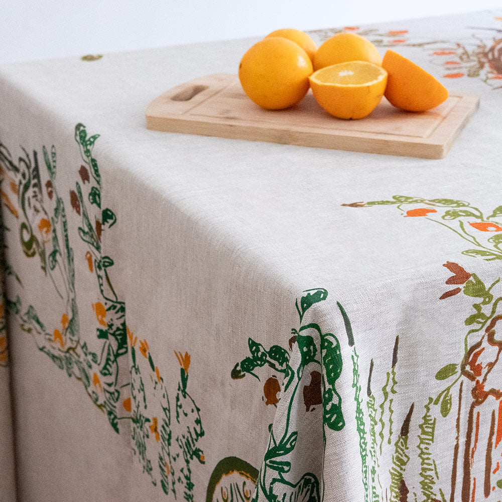 Square linen tablecloth decorated with handcrafted screen-printed design using water-based colors. The raw texture of natural linen is embellished with shades of green and orange reminiscent of the Sicilian countryside.