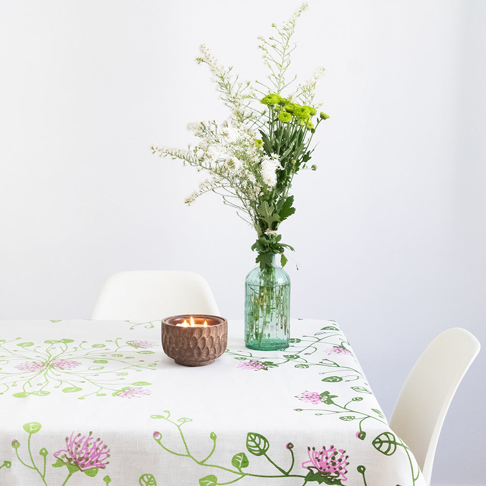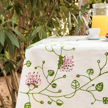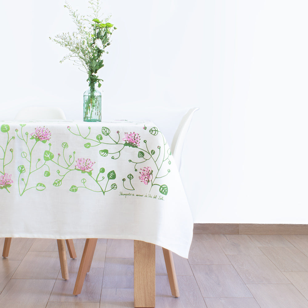 Hand-printed square linen tablecloth. Elegant and minimal table setting with the Cappero tablecloth. Delicate colors in shades of pink and green and a subtle texture in white linen are ideal for adding elegance and freshness to the table. Perfect for special occasions and everyday dining.