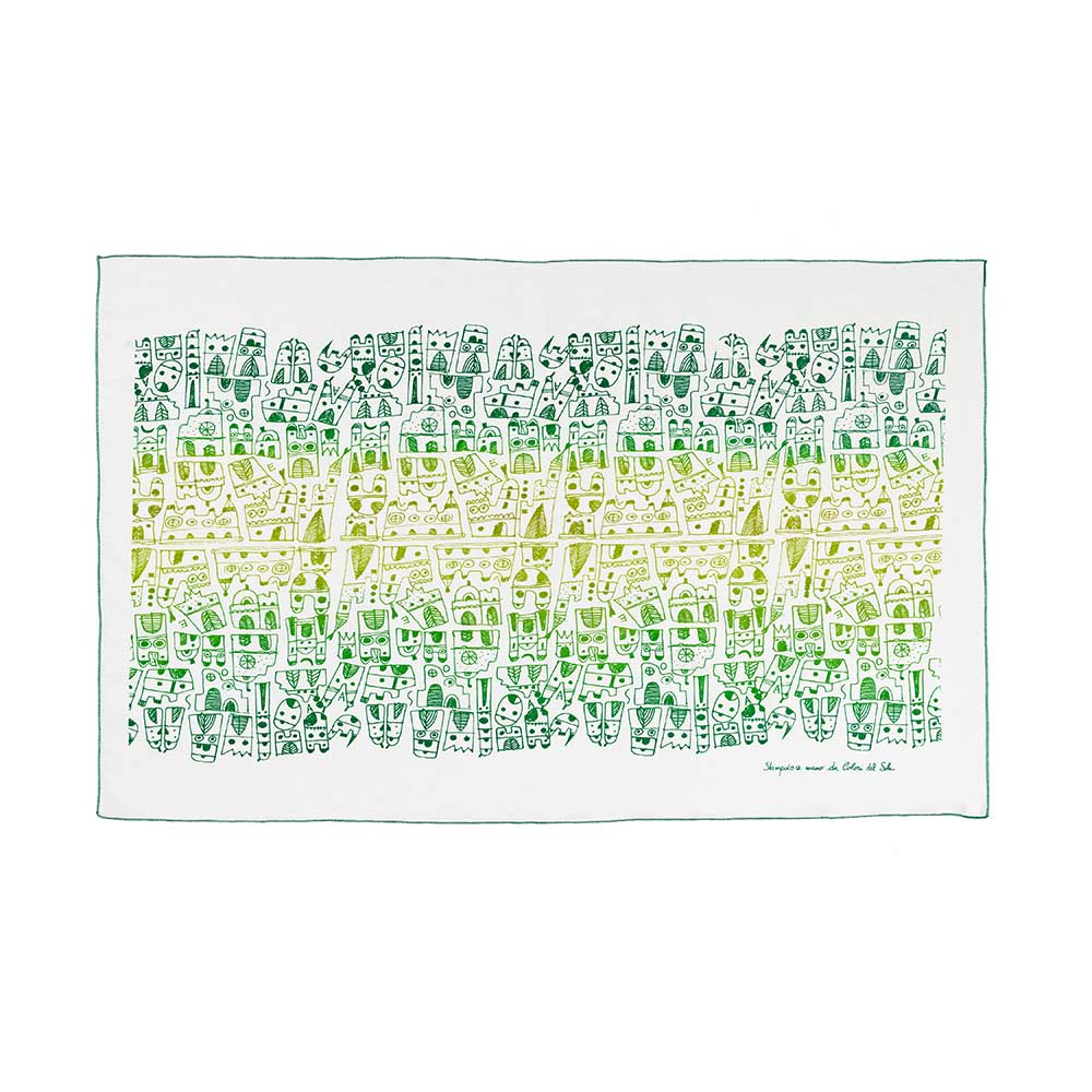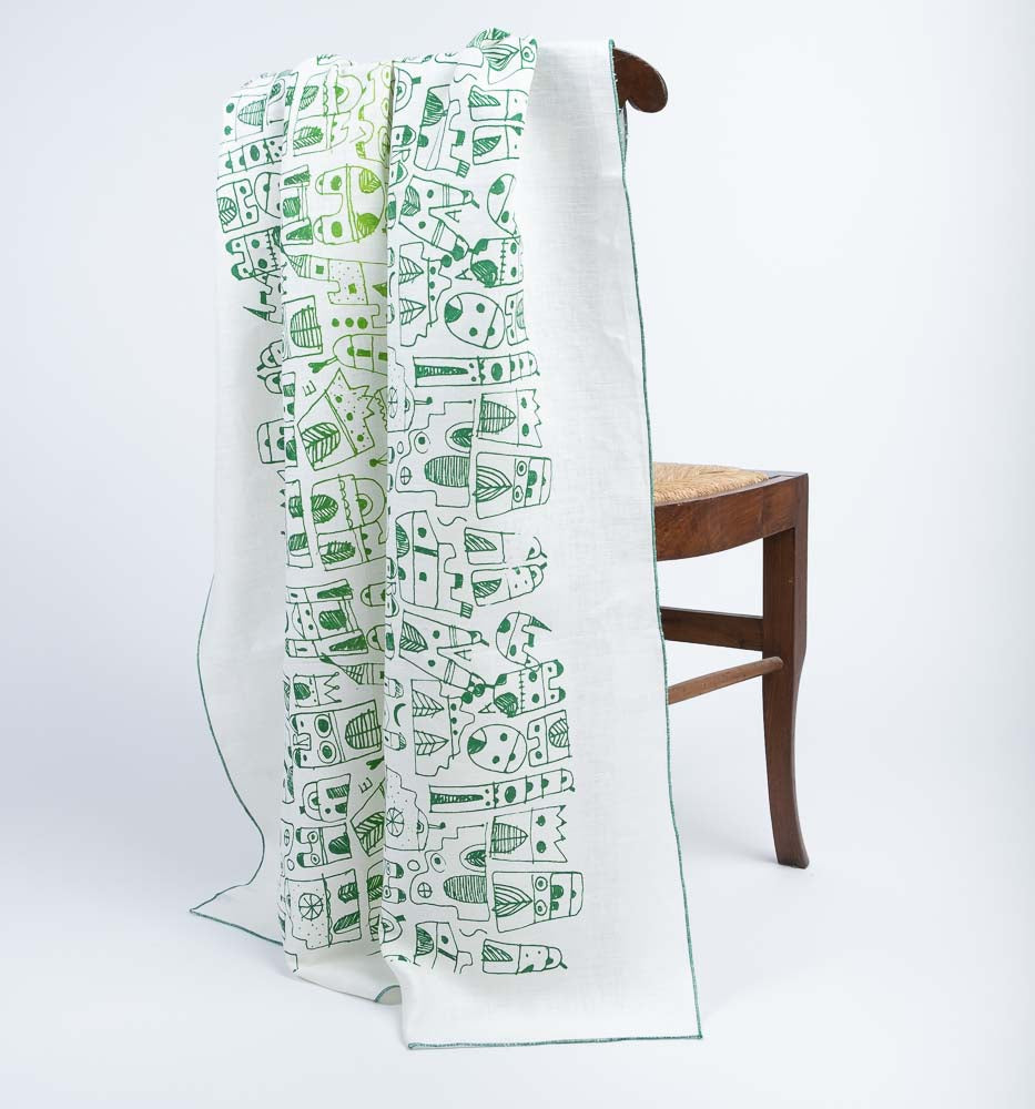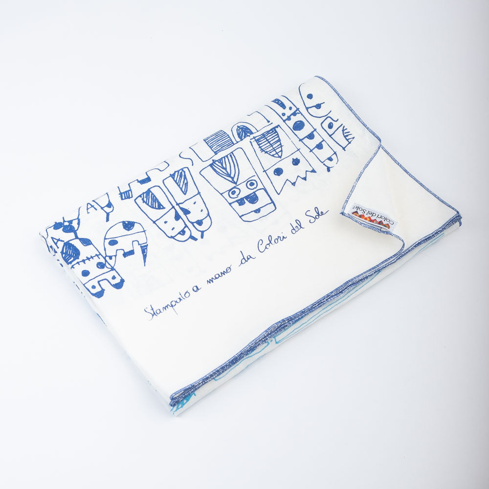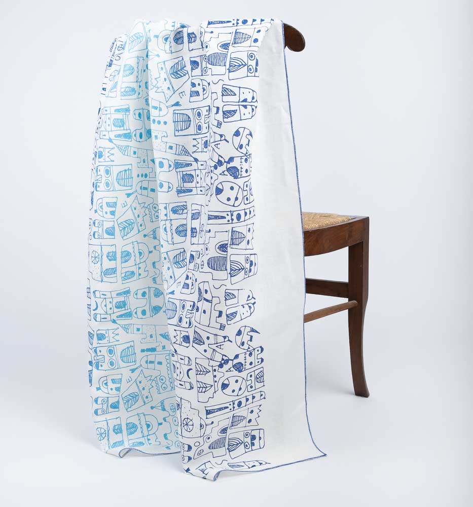 The Casuzze beach towel is a vibrant and colorful handmade product. Made of a linen-cotton blend fabric and silk-screen printed with non-toxic water-based colors. Available in blue and green.