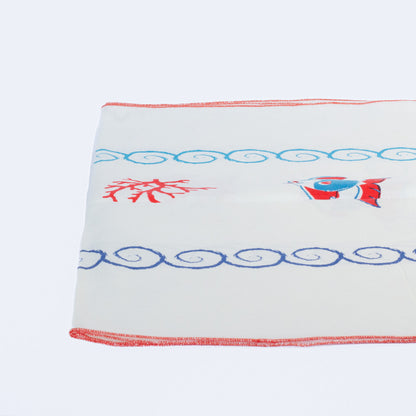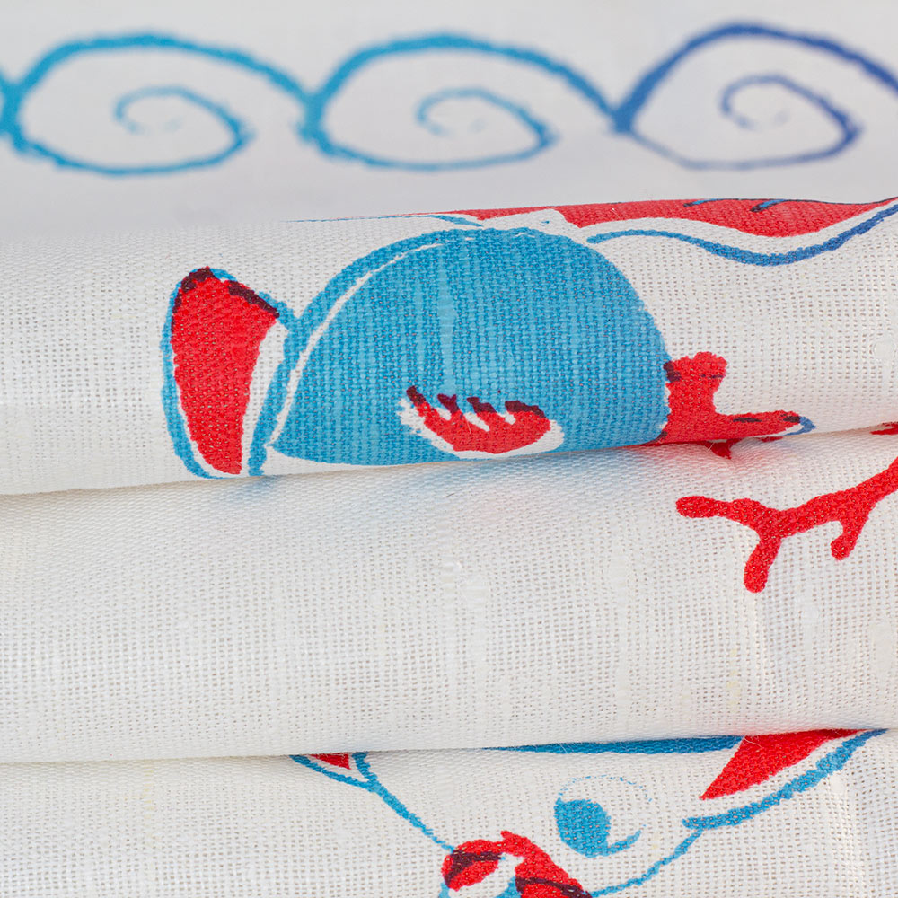 Coralli Table Runner in linen blend, decorated with artisanal screen printing featuring corals, fish, and waves.