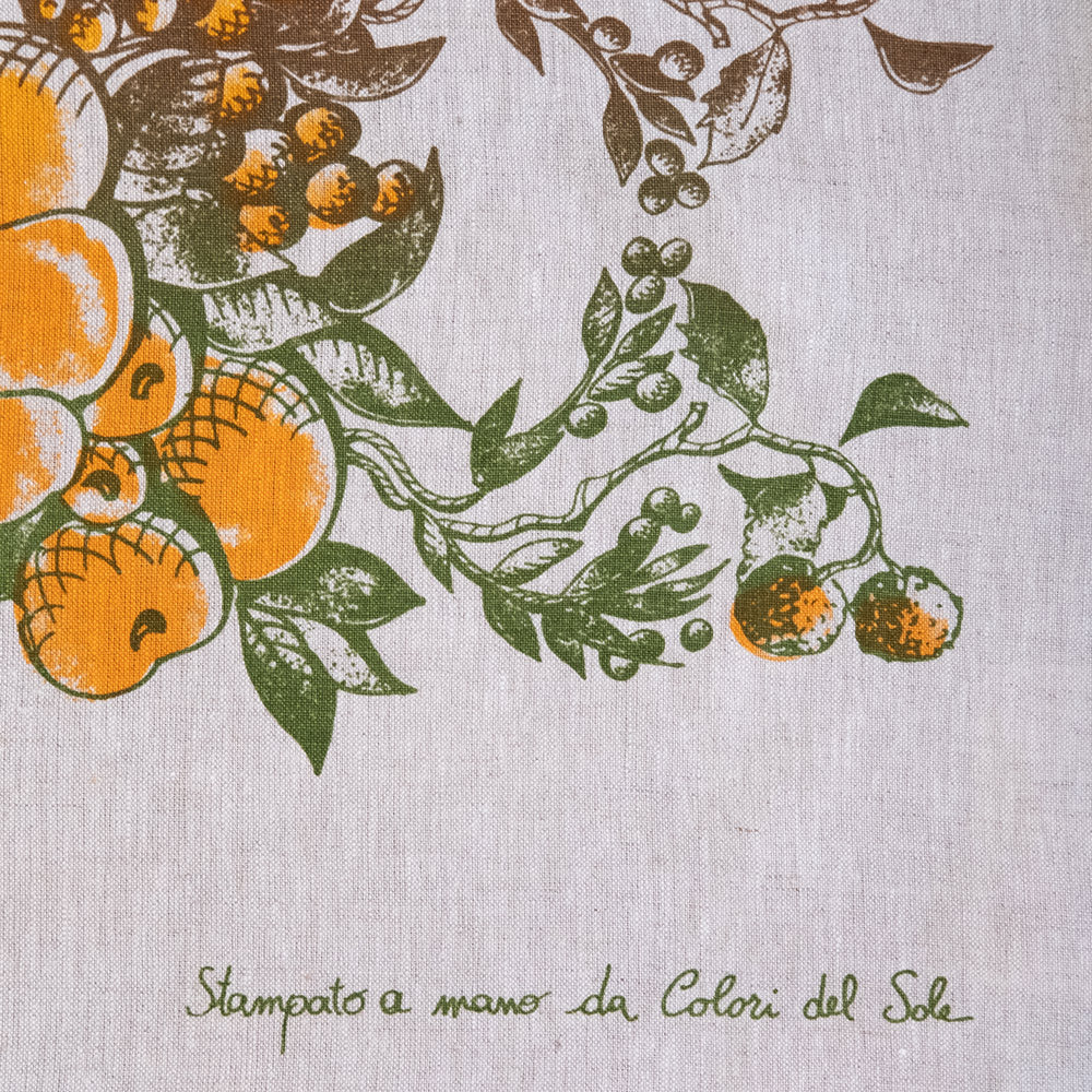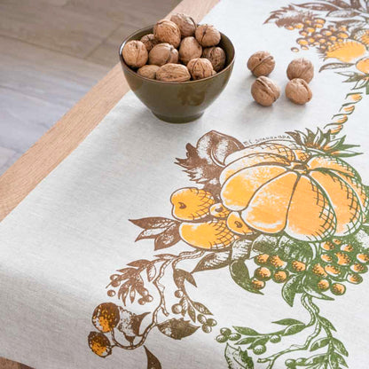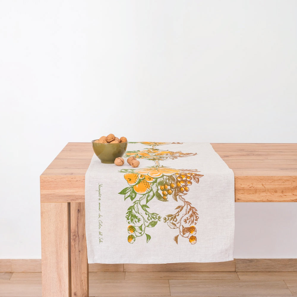 Table runner in linen decorated with screen-printed design. The natural fabric and the richness of artisanal printing make the Ancient Fruits runner the protagonist of a simple and elegant table setting. Ideal for those who love warm and natural colors. Inspired by the beauty of autumn, but perfect for any time of the year.