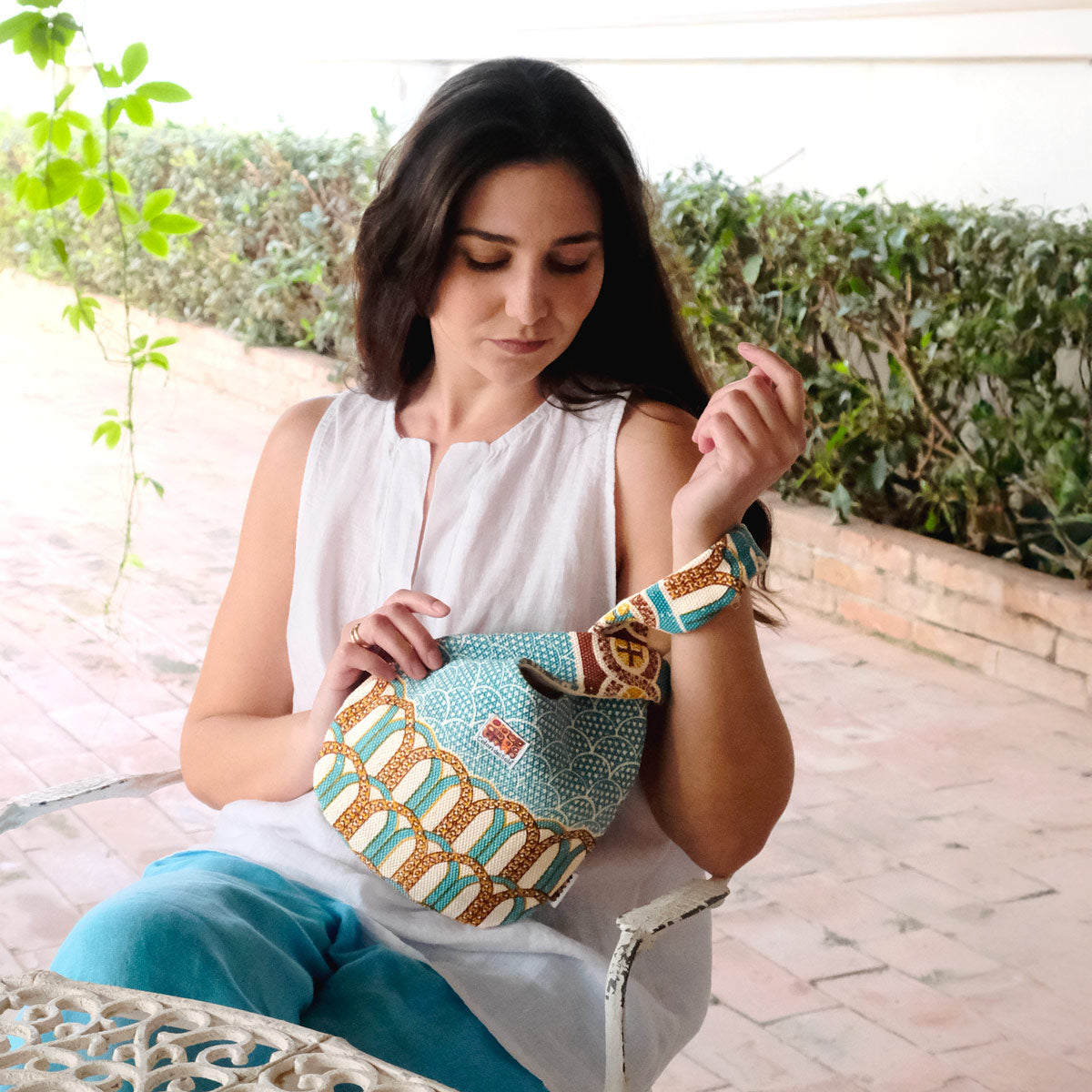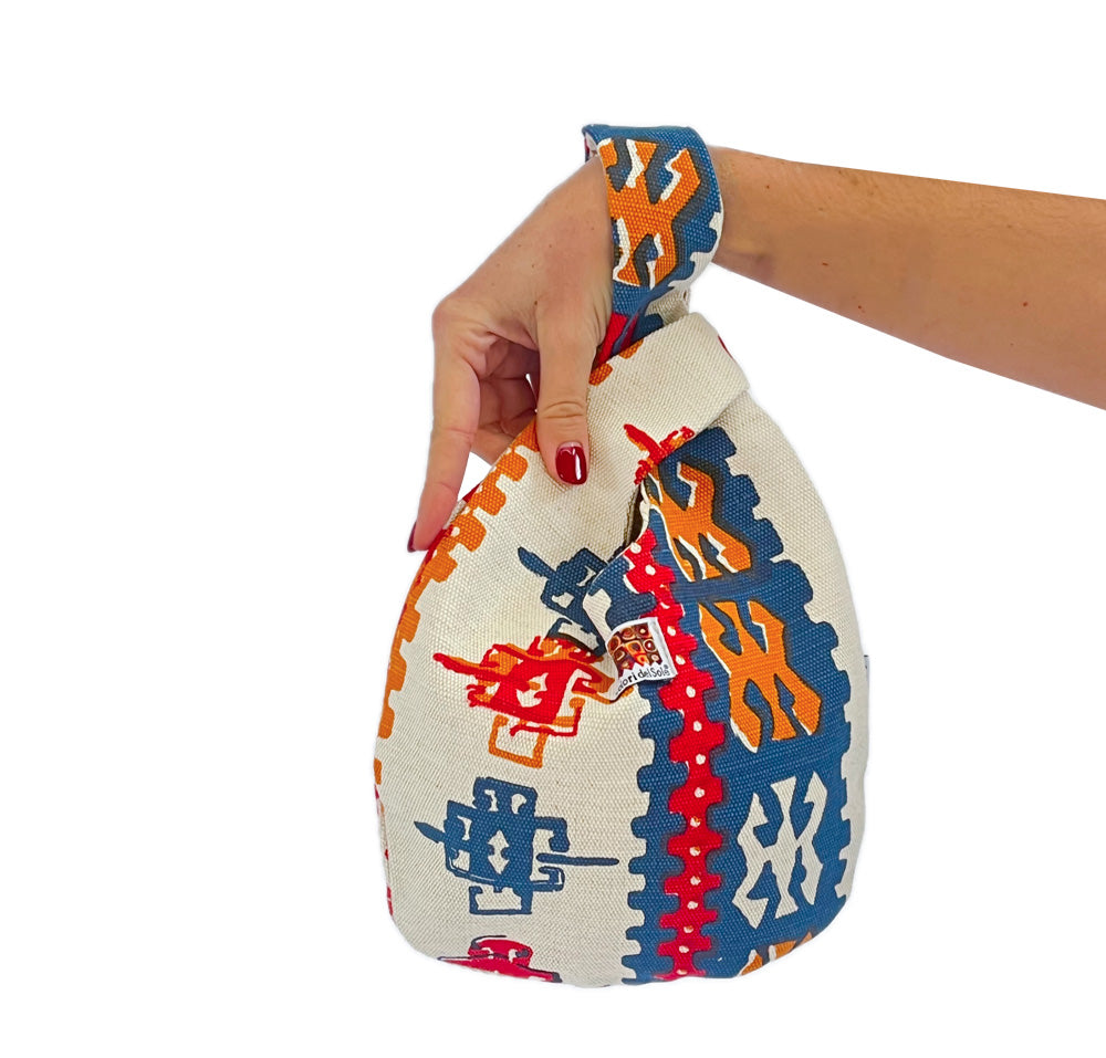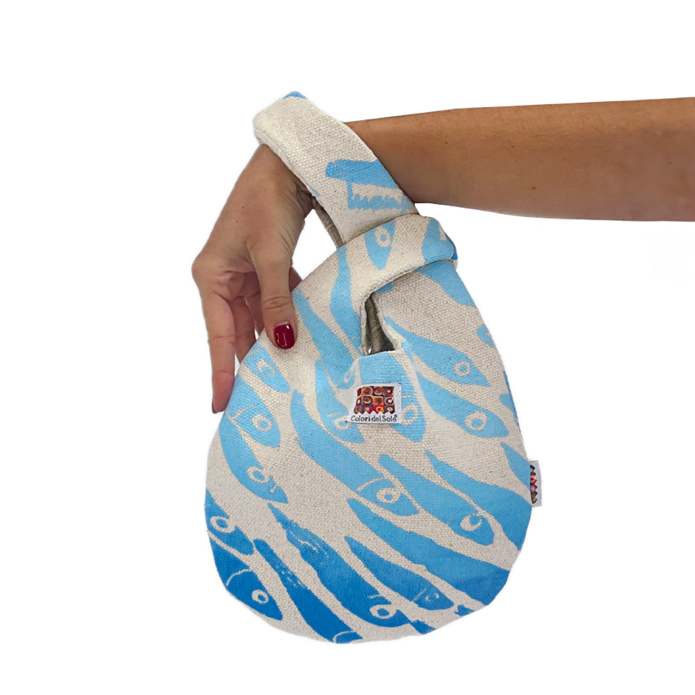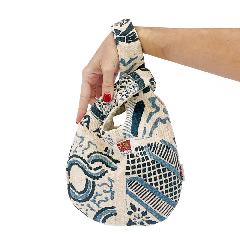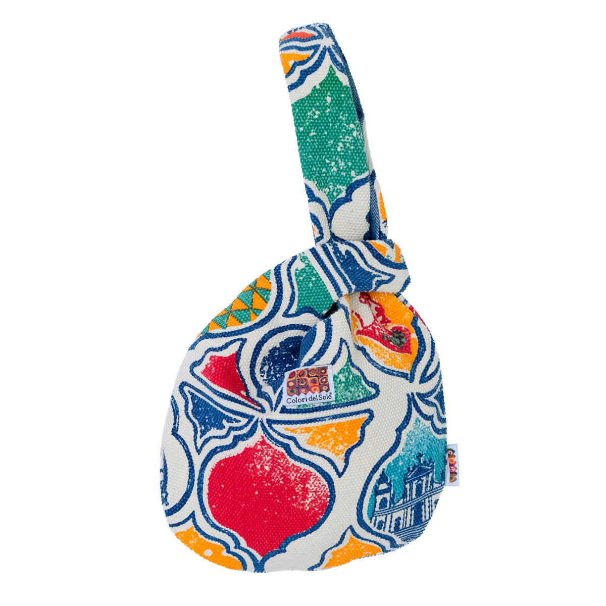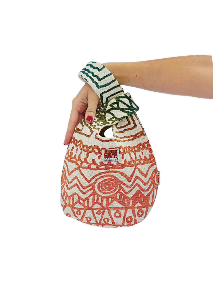 Cotton handbag decorated with manual screen printing. An essential design that doesn't compromise on style. Suitable for any occasion, perfect for an aperitif or to add a touch of color and flair to a simple look. Available in various patterns.