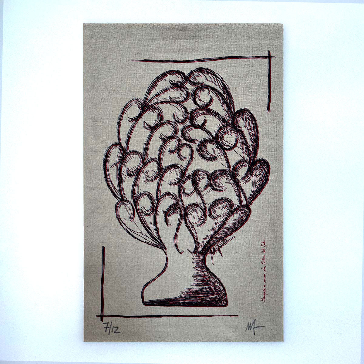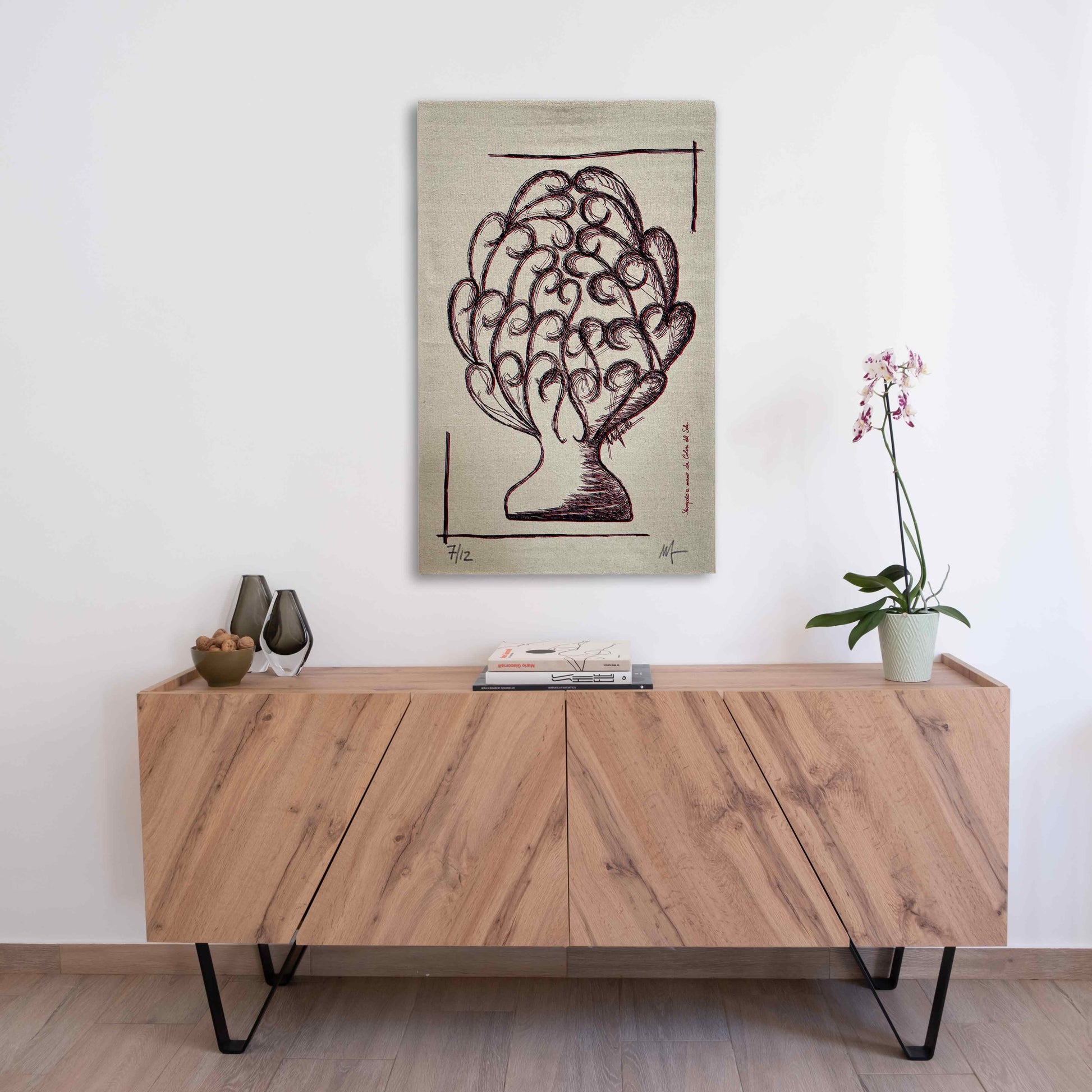 Tapestry in natural canapone, hand-printed with water-based colors using the ancient serigraphic technique. The Pigna is a traditional subject of Sicilian artistic and cultural heritage, often found in ceramic craftsmanship. A rustic home décor piece with a clear reference to Mediterranean style. The Large Pigna tapestry in canapone can be easily hung on the wall using the large wooden frame.