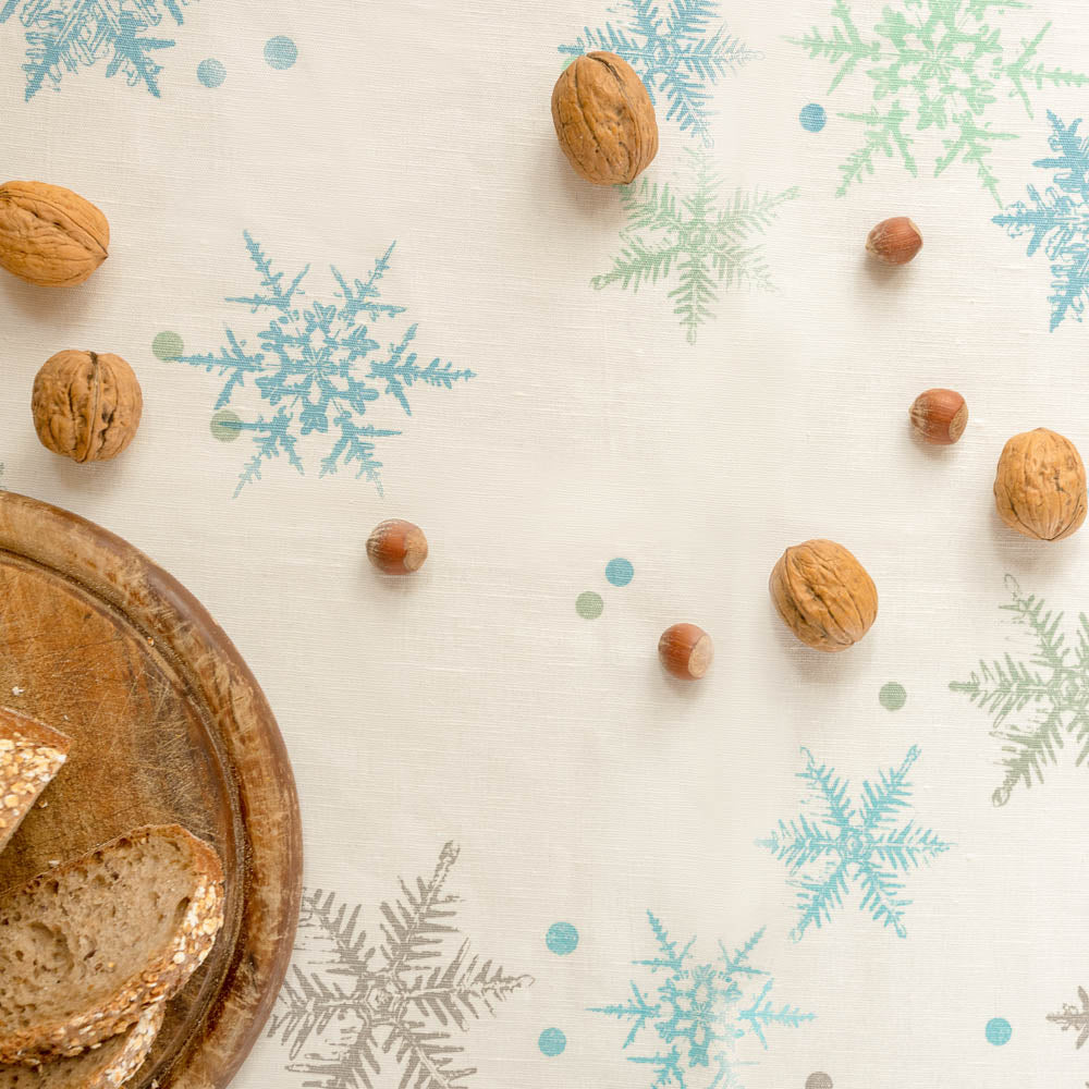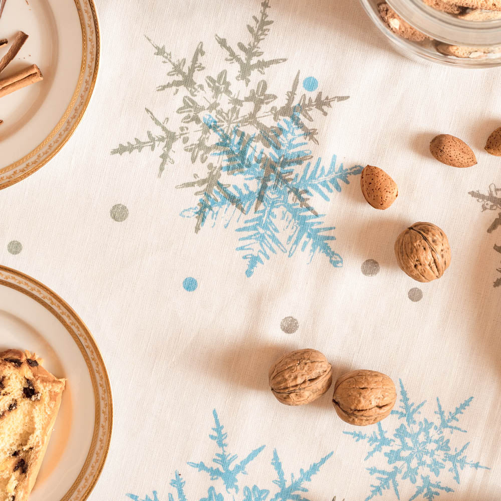 Rectangular linen tablecloth decorated with screen-printed design. Snowflakes in shades of blue on a white background create an elegant, delicate, and striking product.