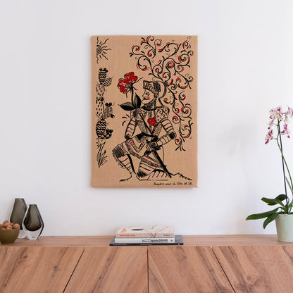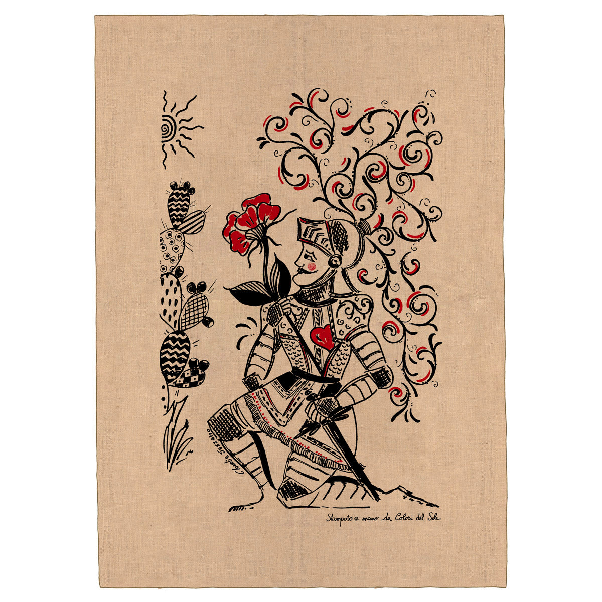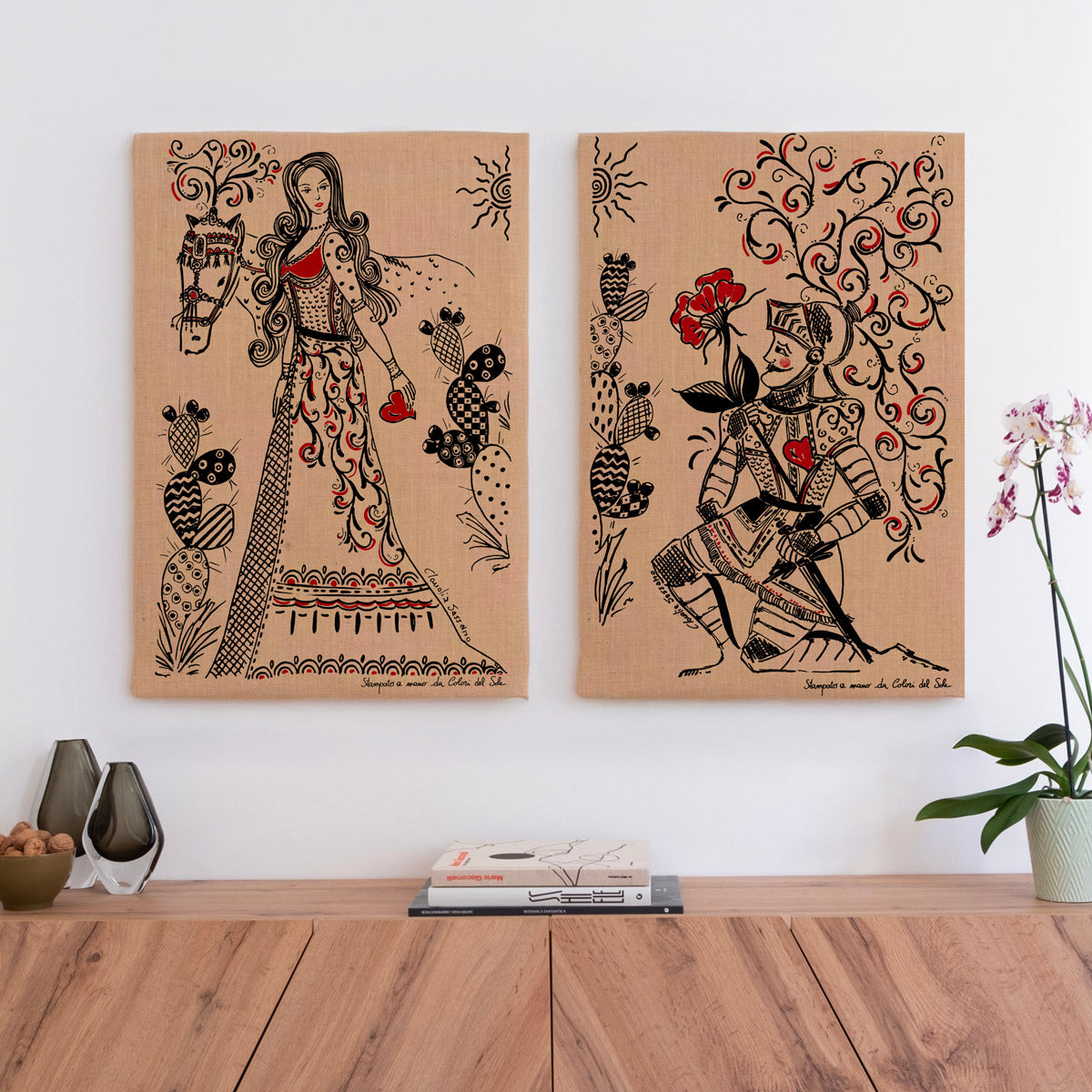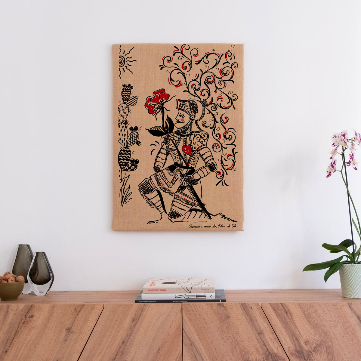 Handcrafted using screen printing and water-based colors, the tapestry conveys the strength and tragedy of this unrequited love. The bold lines and the intense red of passion that characterize Orlando reflect his inner turmoil, while the jute fabric gives the scene a texture reminiscent of the rustic beauty of Sicilian traditions. More than just a decorative piece, it is a testament to a story that lives on in Sicilian puppetry and in the hearts of those who cherish Sicilian art and culture.