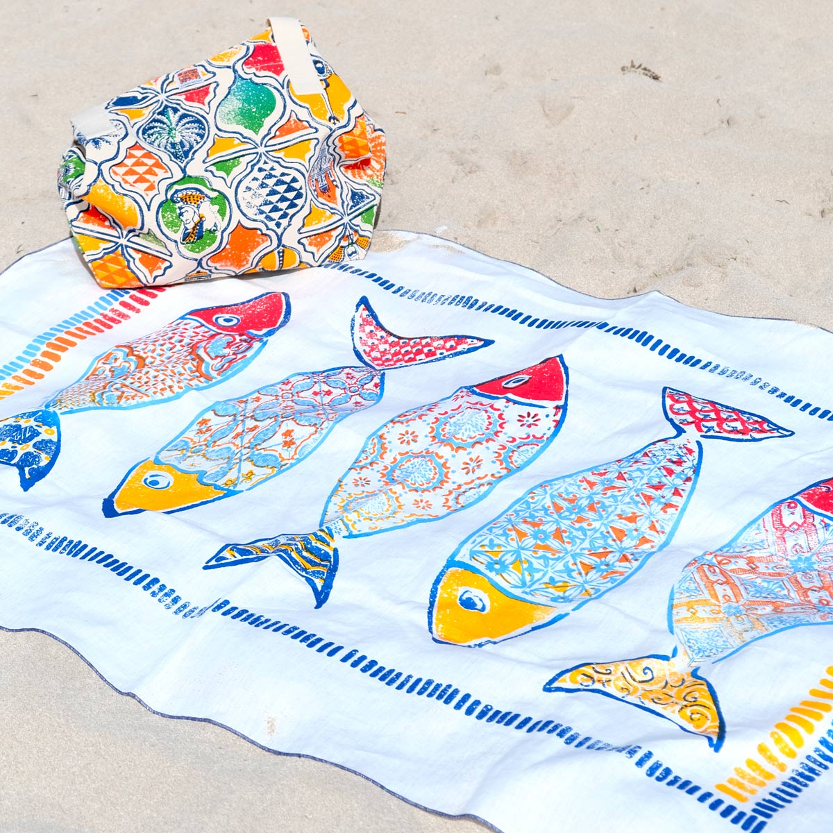 Artisanal linen beach towel with hand-made screen printing. The main elements are stylized fish inspired by Sicilian maiolica, in a weave of vibrant colors and refined details. A design that blends tradition and creativity for a unique aesthetic.