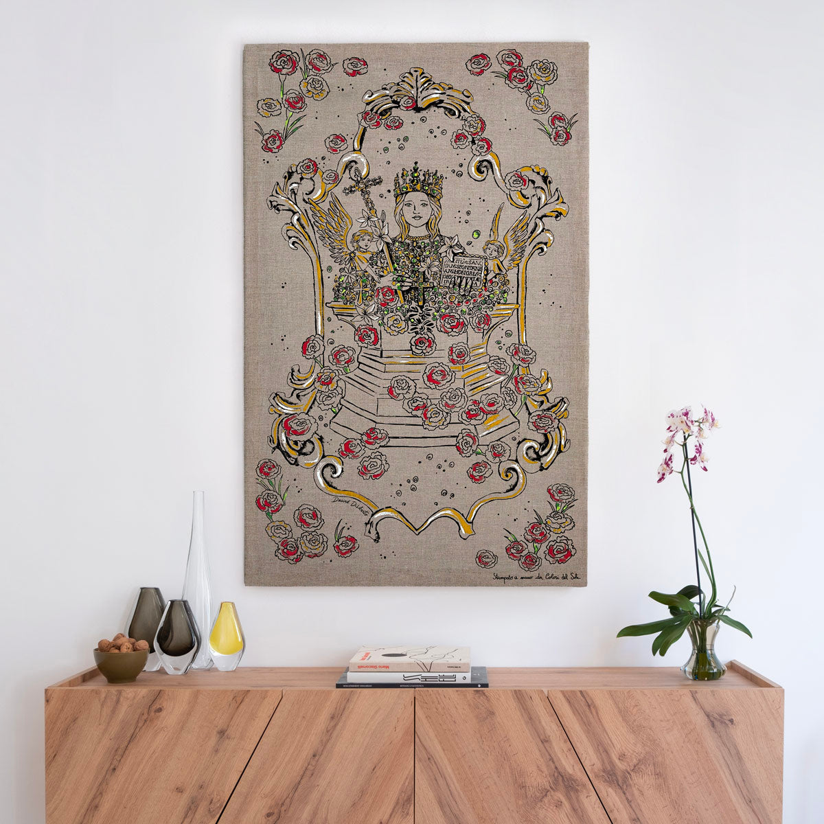The design, born from a careful iconographic study, comes to life through ecological water-based colors that give depth and character to the work. The decorative elements - flowers, golden motifs and precious details - are hand-finished, guaranteeing the uniqueness of each piece.