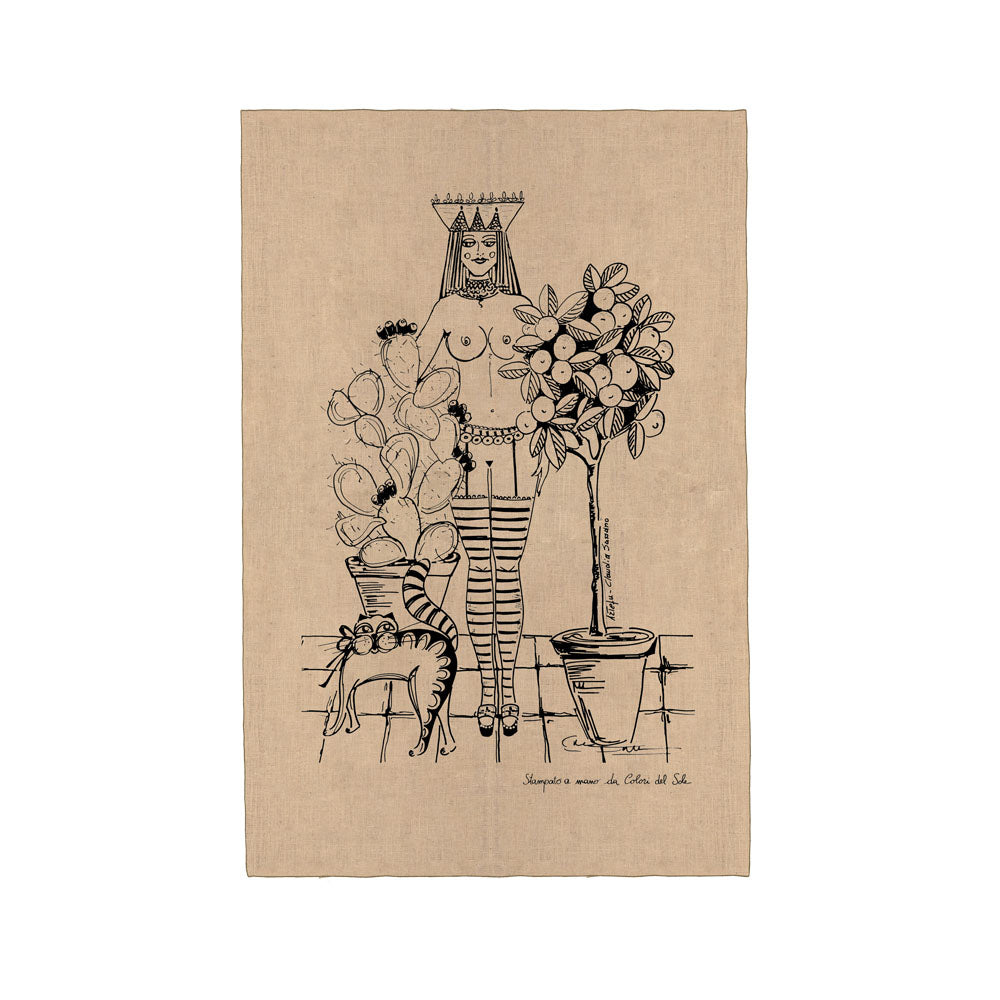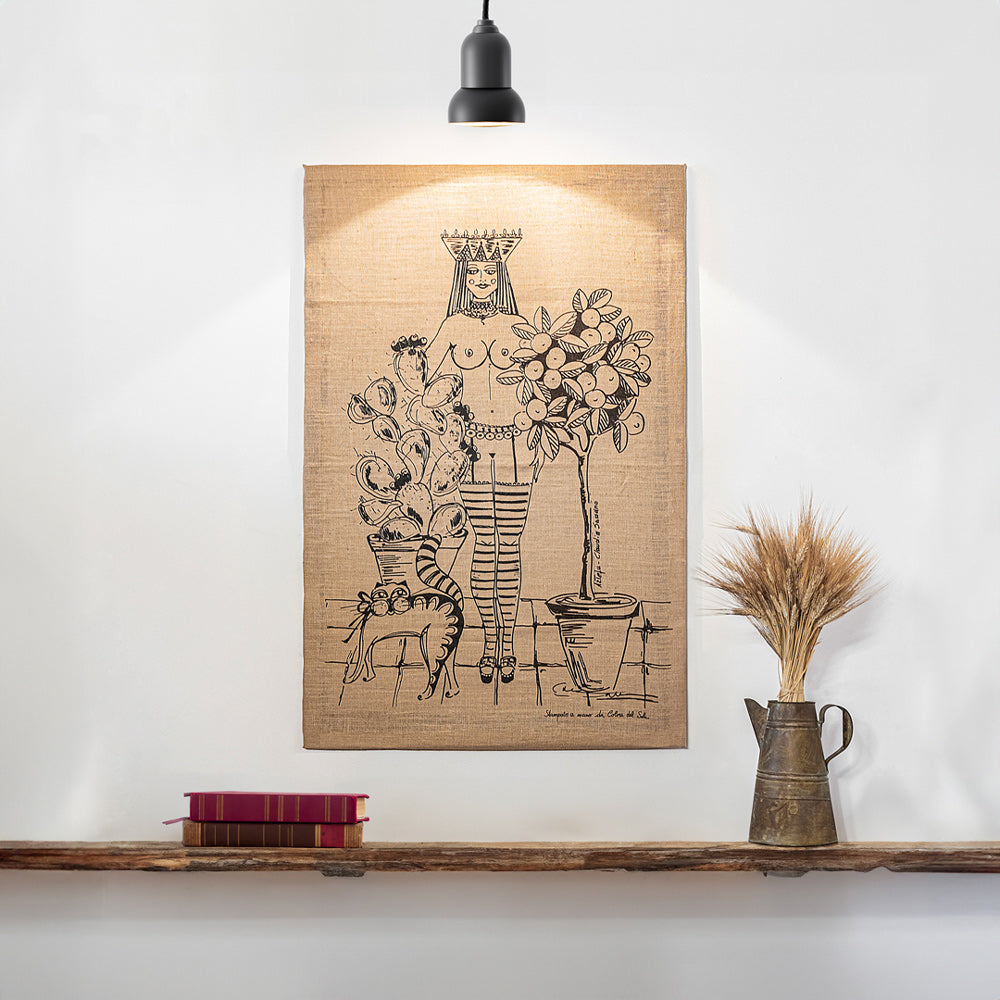 Wall tapestry in a modern style, made of natural jute and hand-printed using the screen printing technique. Thick texture and warm, natural colors give life to a product that is simple yet rich in carefully crafted details. The tapestry depicts Sicily in all its femininity and beauty. The "Sicilia bedda" tapestry hangs on the wall with a large frame.