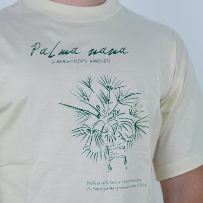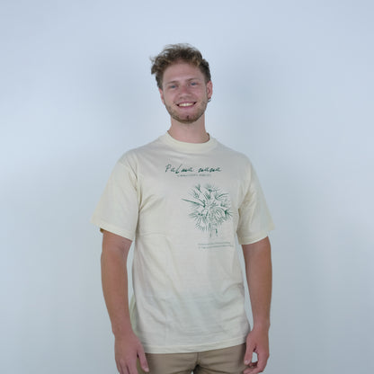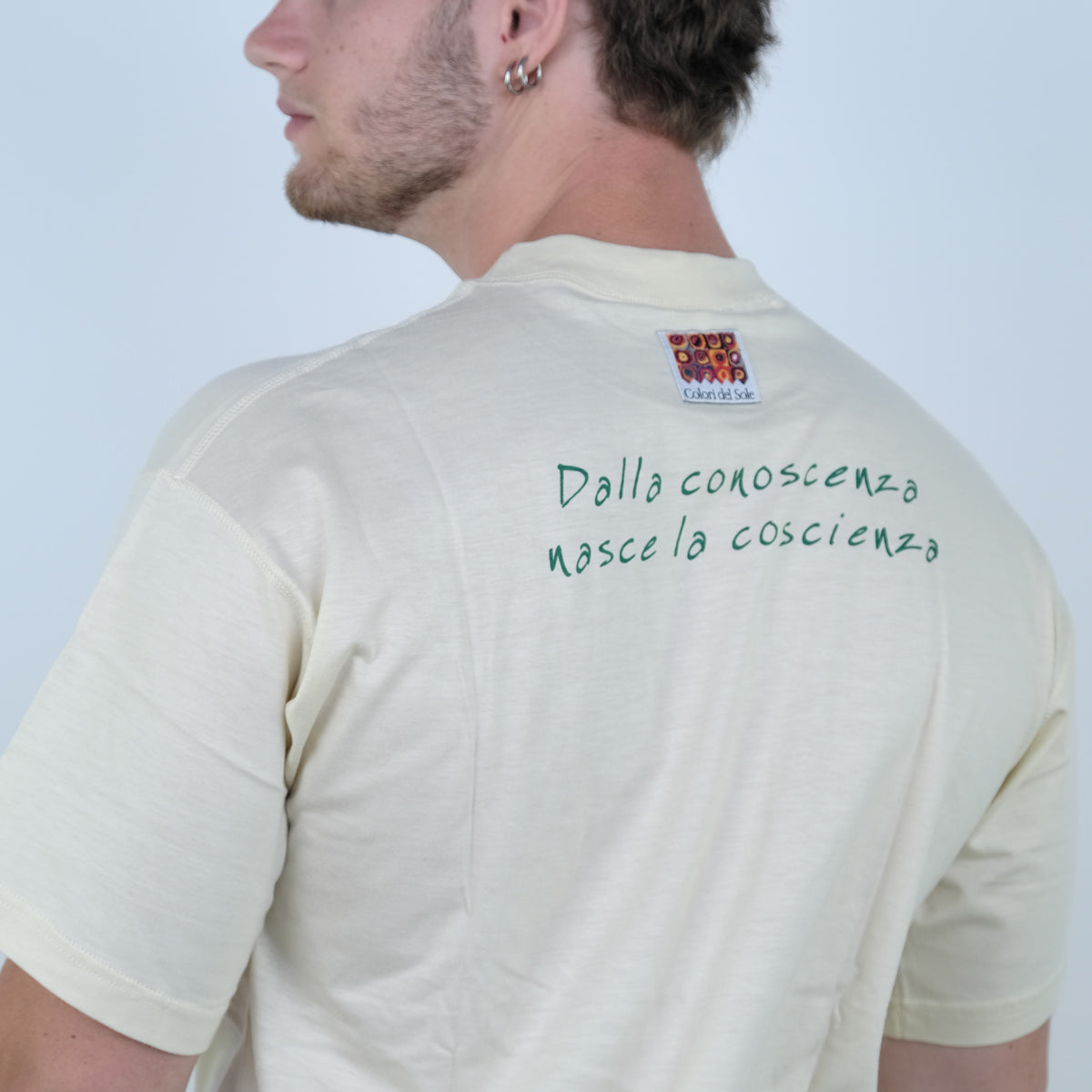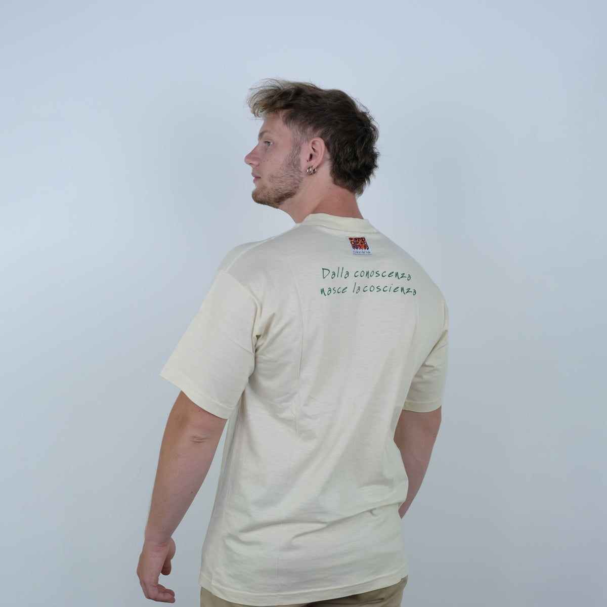 T-shirt unisex ecrù dalla vestibilità regular realizzata in puro cotone, girocollo e maniche corte. Stampa serigrafica e dettaglio con scritta.