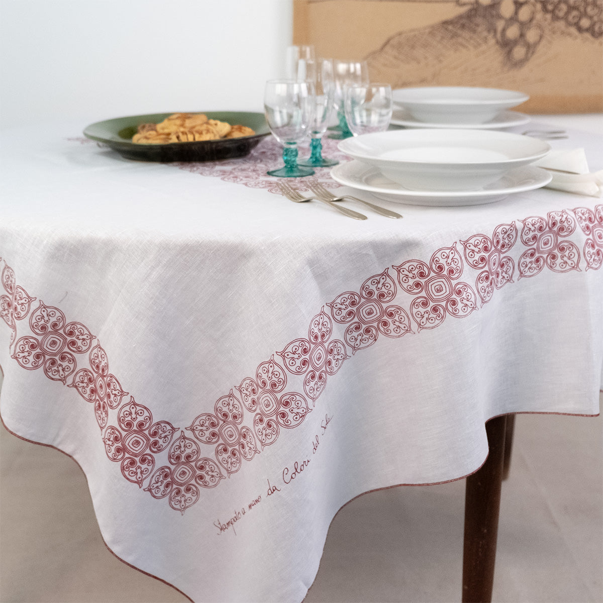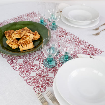 Rendi la tua tavola unica con la splendida Tovaglia Cristino di Colori del Sole. Realizzata in puro lino di alta qualità, questa tovaglia si distingue per la sua eleganza e il suo design raffinato, impreziosito da un'esclusiva stampa artigianale che richiama i motivi tradizionali siciliani.