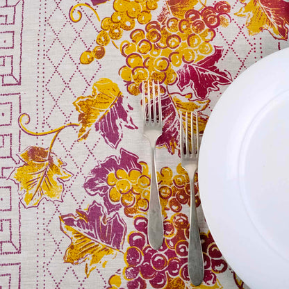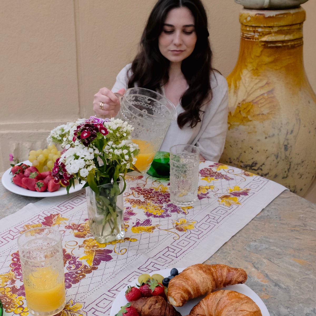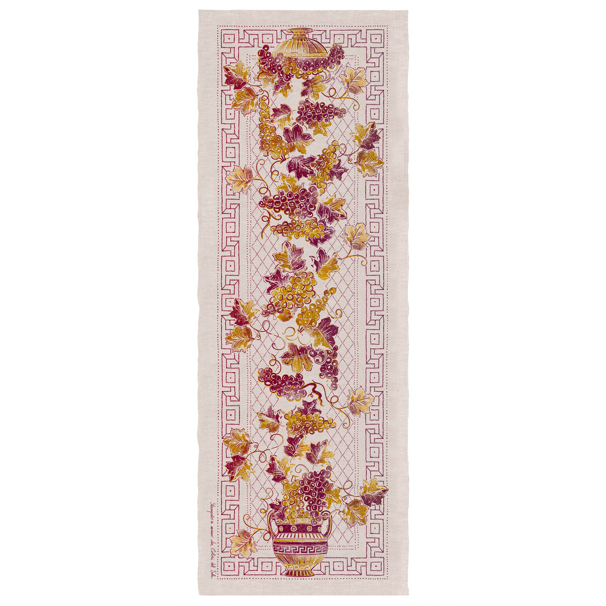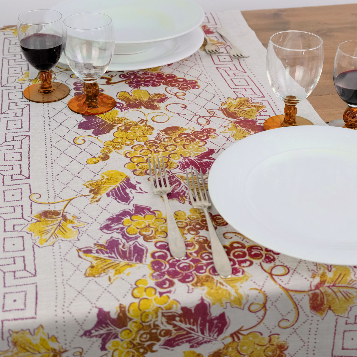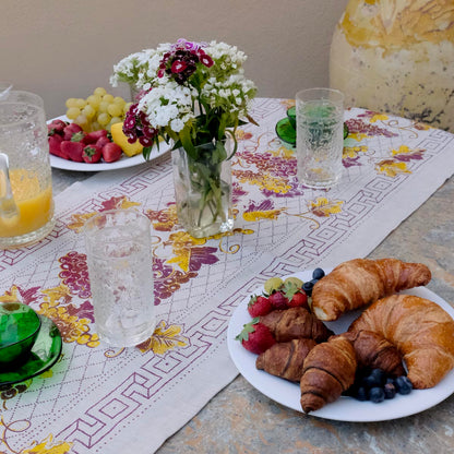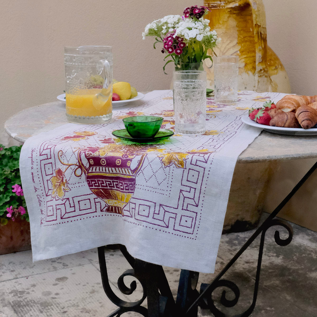 Timeless elegance takes shape in the “Uva Solunto” table runner, artisanally crafted from fine natural linen. The design, inspired by classical Sicilian tradition, features grapevines intertwined with geometric patterns reminiscent of Greco-Roman art. Warm shades of wine red and golden yellow bring depth and vibrancy to the composition, while the hand-printing process makes each piece unique and unrepeatable. Perfect as a centerpiece or to enrich an outdoor breakfast, this runner brings the charm of Mediterranean homes and the refinement of handcrafted work. A touch of art to enjoy every day.