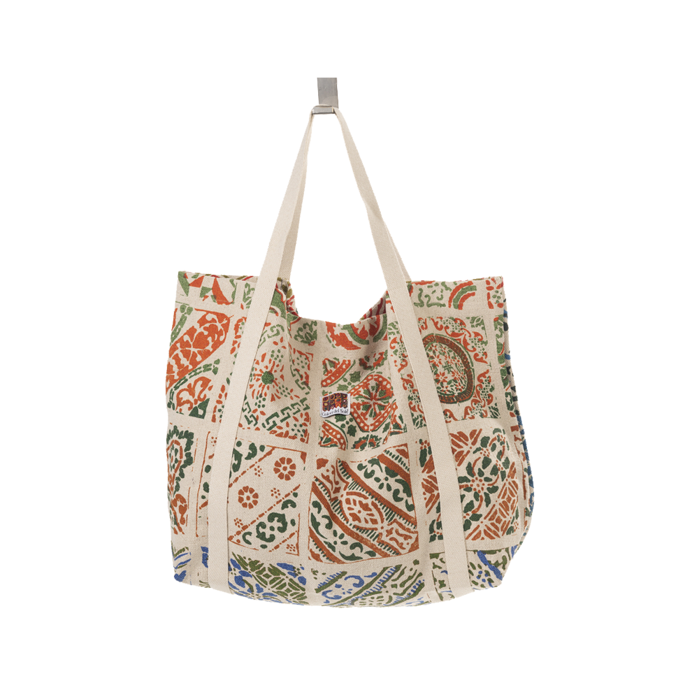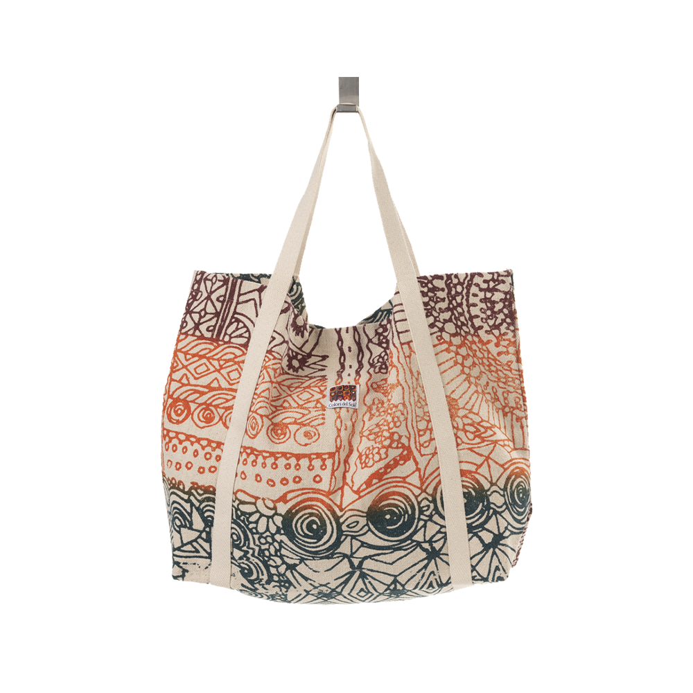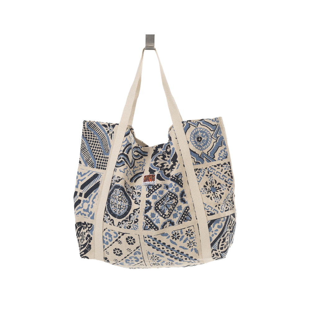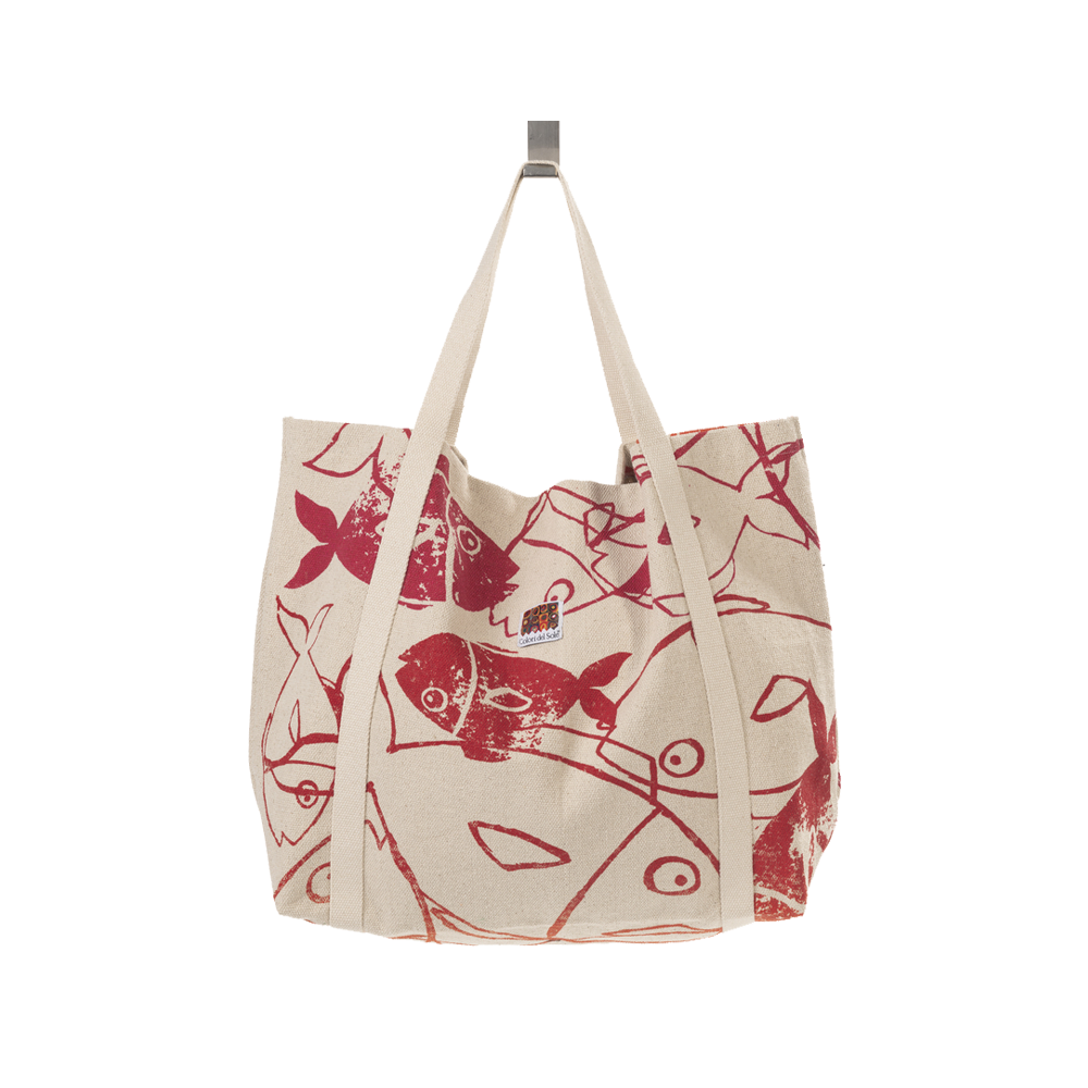 Handcrafted cotton bag hand-printed using the silk-screen technique. Practicality and simplicity in an extralarge bag ready to accompany you on the busiest days. A matching clutch with the same patterns is available.