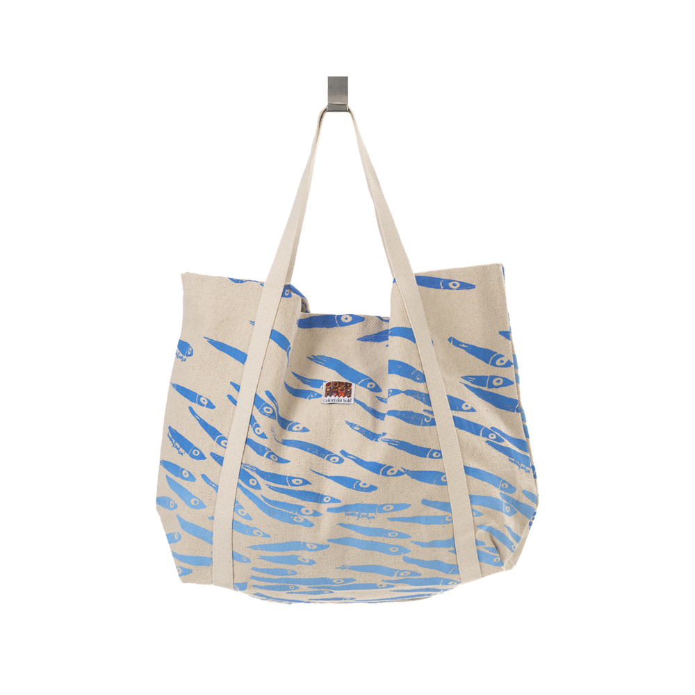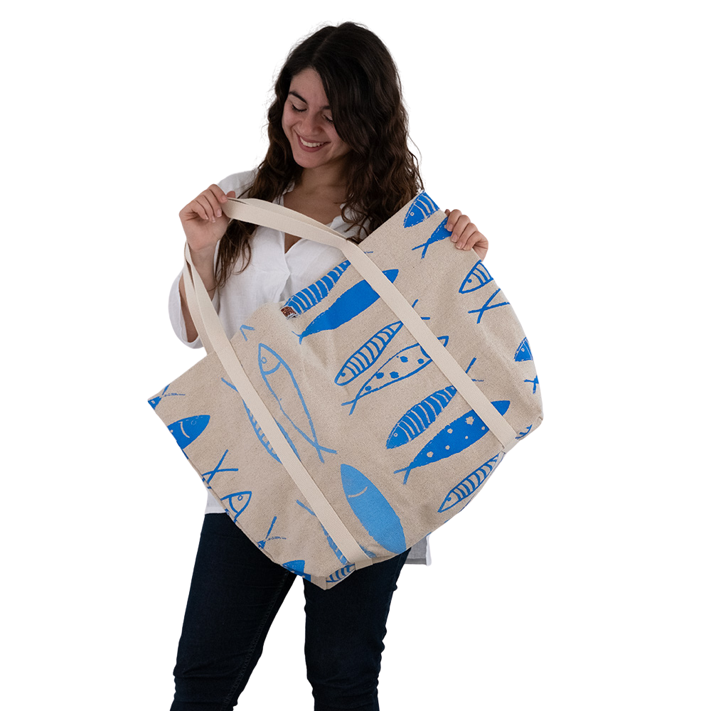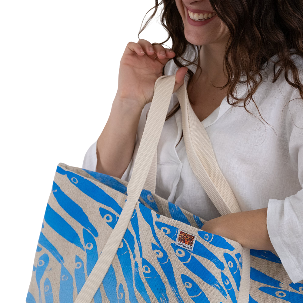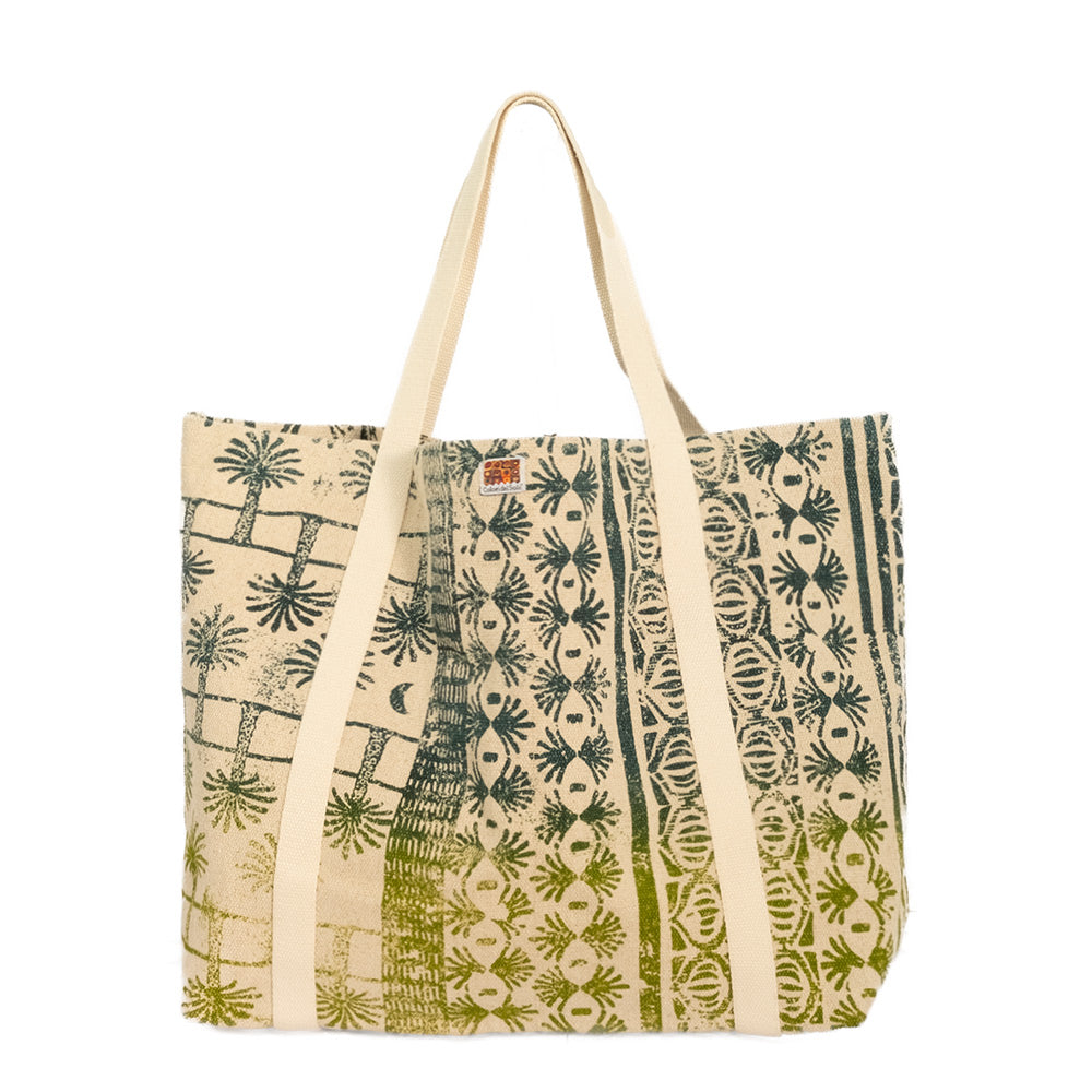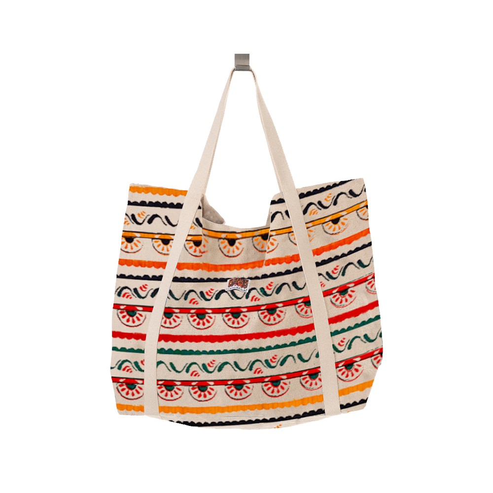 Handcrafted cotton bag hand-printed using the silk-screen technique. Practicality and simplicity in an extralarge bag ready to accompany you on the busiest days. A matching clutch with the same patterns is available.