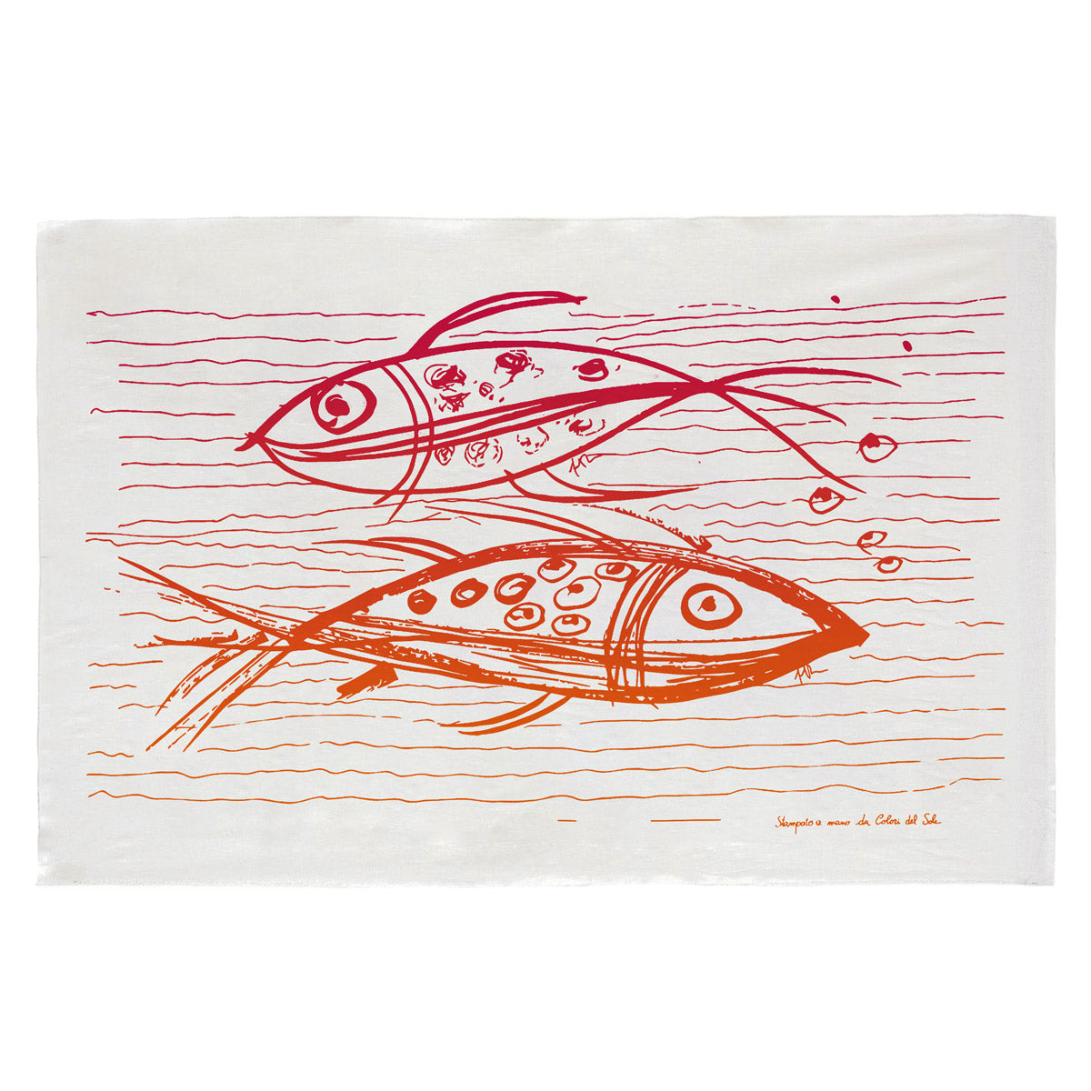 Il disegno raffigura due pesci stilizzati nelle tonalità vivaci del rosso, simboli della tradizione mediterranea.