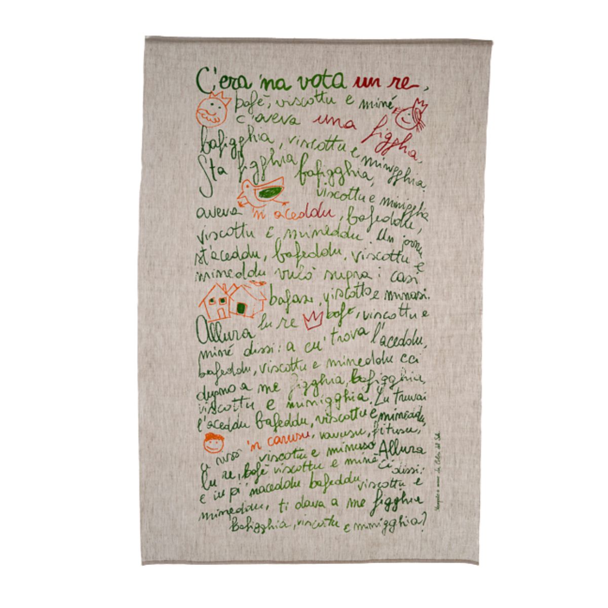 L'arazzo Befè si ispira a una filastrocca tipica della tradizione popolare siciliana, spesso utilizzata per intrattenere i bambini. Racconta in modo giocoso di un re, sua figlia e un uccello, tutti con nomi fantasiosi: un’immagine vivace di personaggi legati alla tradizione e al simbolo del biscotto, tipico alimento siciliano.