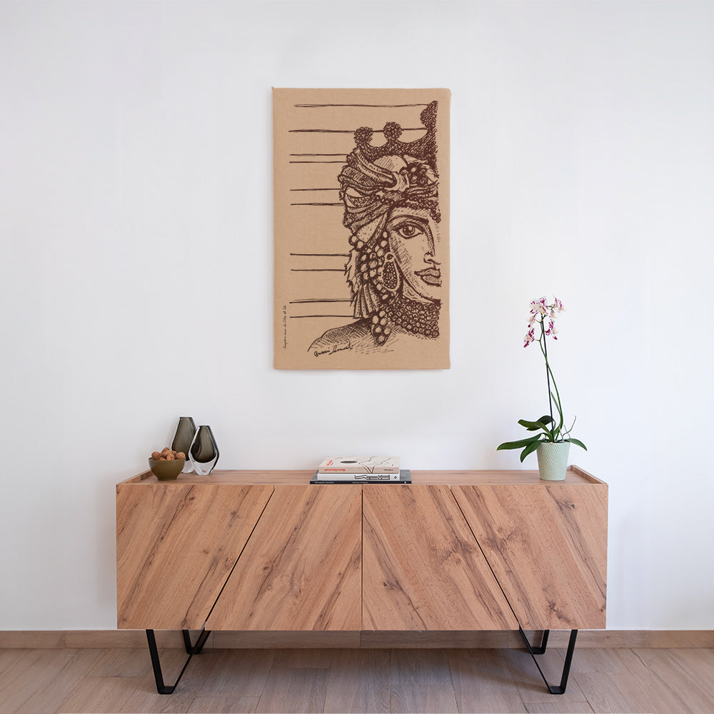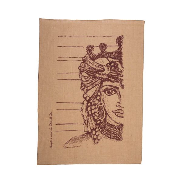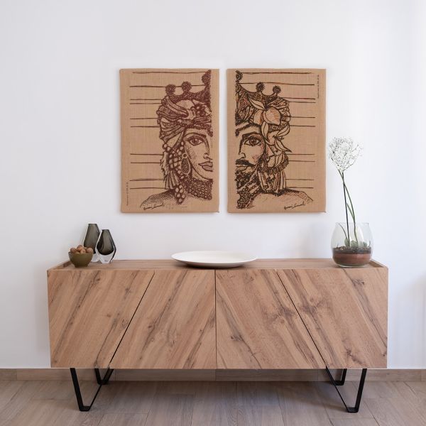 L’arazzo Dama trova ispirazione nella tradizione artistica e culturale siciliana: la Dama siciliana che si innamora del Moro, divenendo i tormentati protagonisti della nota leggenda popolare. L'arazzo Dama grande si appende alla parete con il telaio di legno piccolo.