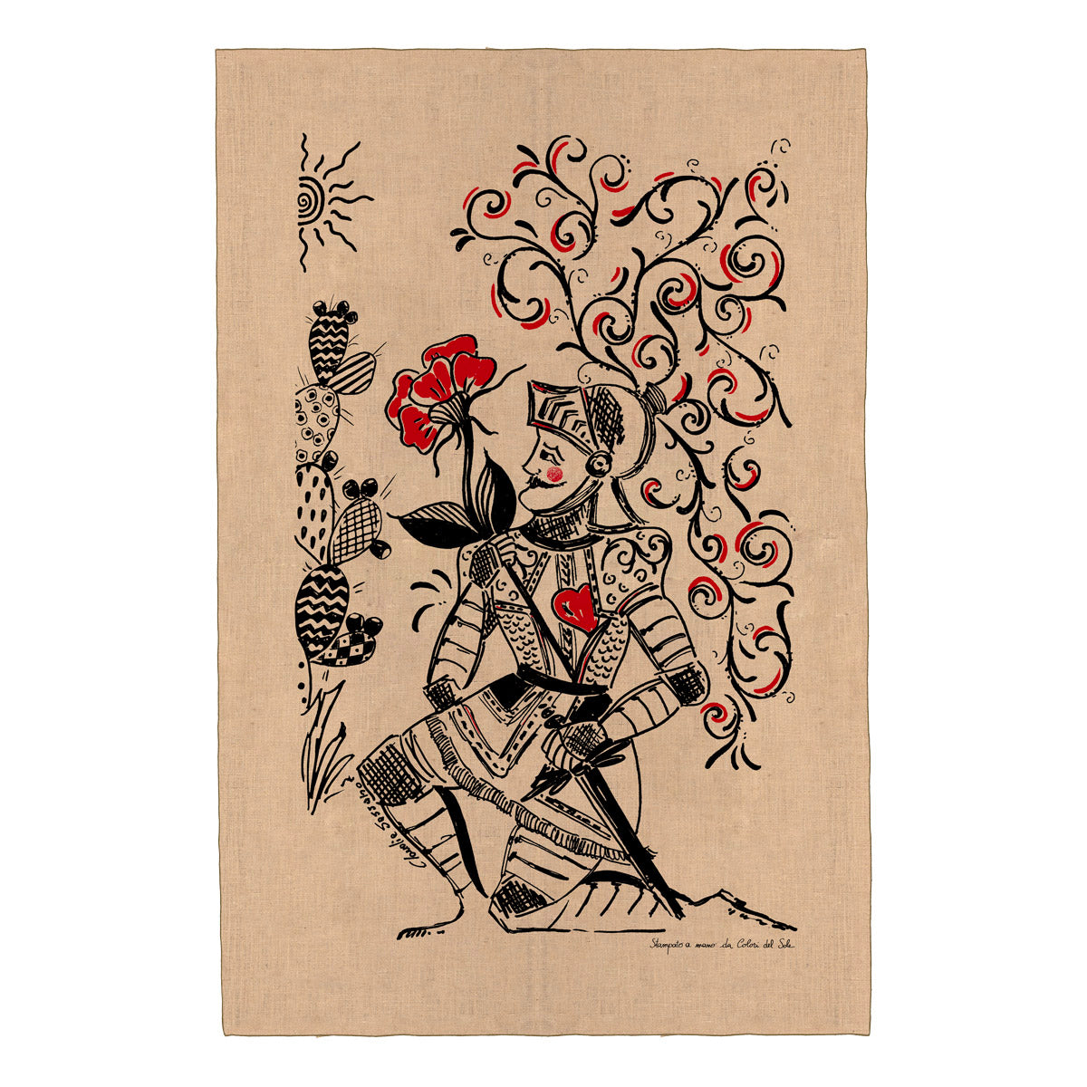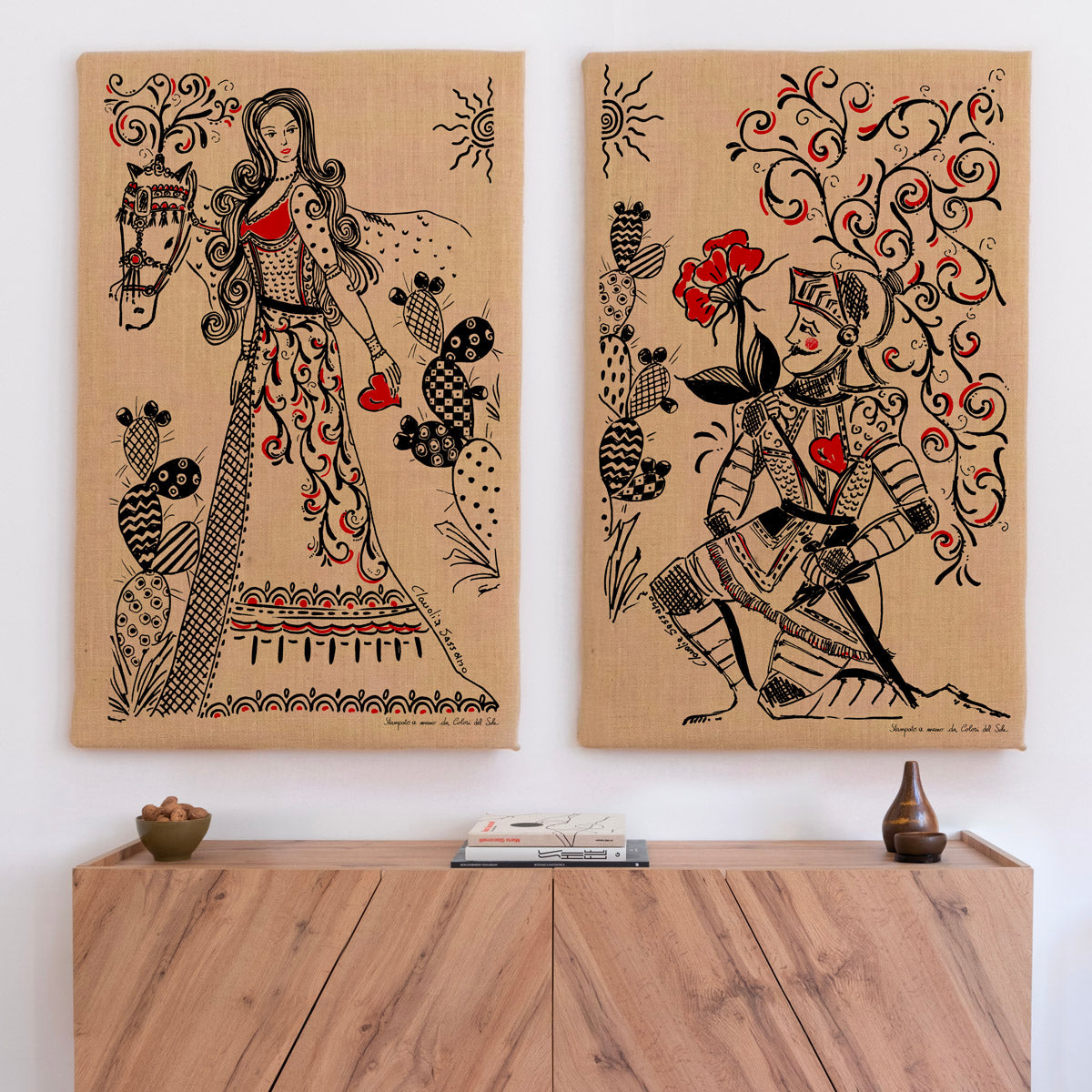 Realizzato a mano con serigrafia e colori ad acqua, l’arazzo esprime la forza e la tragedia di questo amore non corrisposto. I tratti decisi e l’intenso rosso passione che caratterizzano Orlando riflettono la sua lotta interiore, mentre la juta dona alla scena una consistenza che richiama la bellezza rustica delle tradizioni siciliane. Non è solo un oggetto d’arredo, ma una testimonianza di una storia che vive nelle marionette siciliane e nei cuori di chi ama l'arte e la cultura di Sicilia.