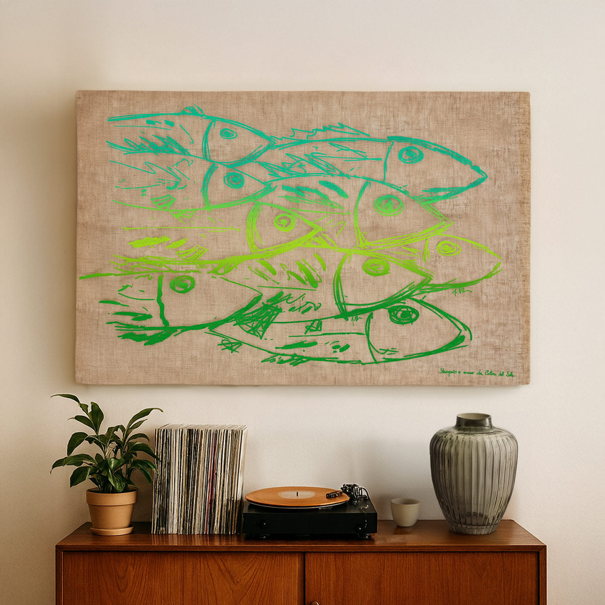 Il disegno raffigura diversi pesci stilizzati nelle tonalità vivaci del verde, simbolo di freschezza, armonia a vitalità mediterranea.