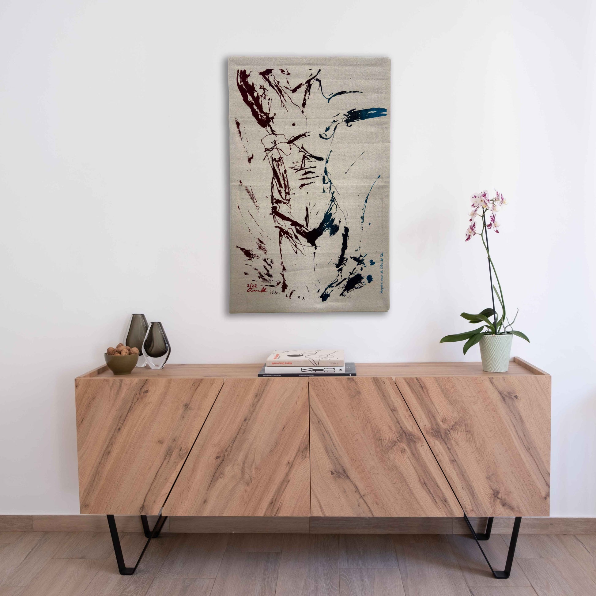 Arazzo stampato a mano con colori ad acqua e raffigurante una figura dinamica stilizzata caratterizzata da tratti gestuali che evocano forza ed eleganza.