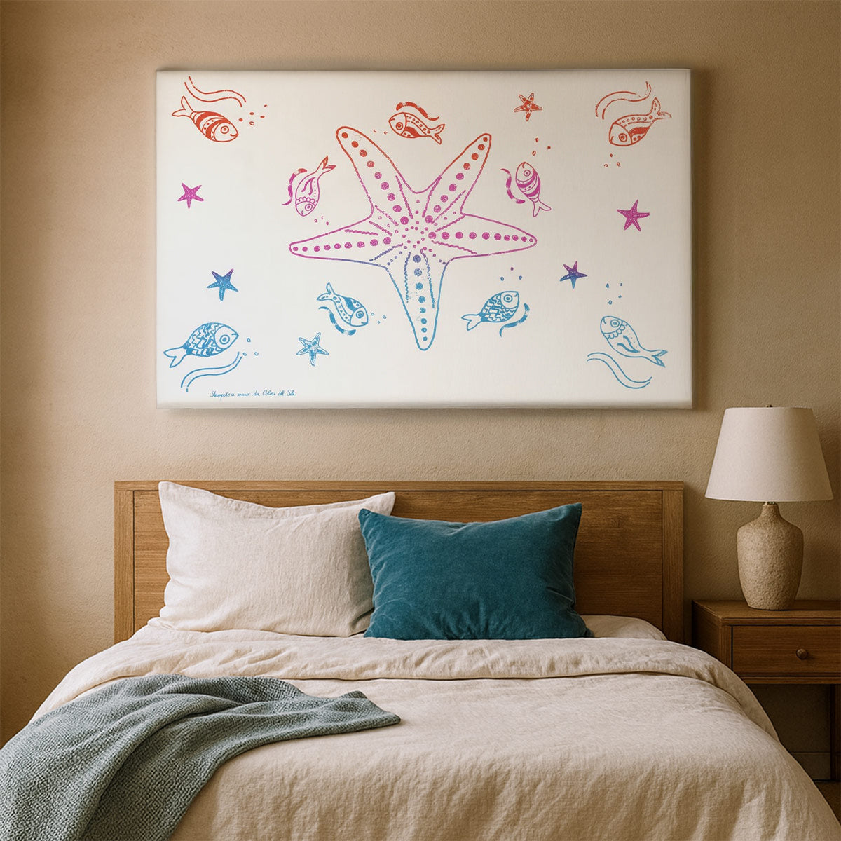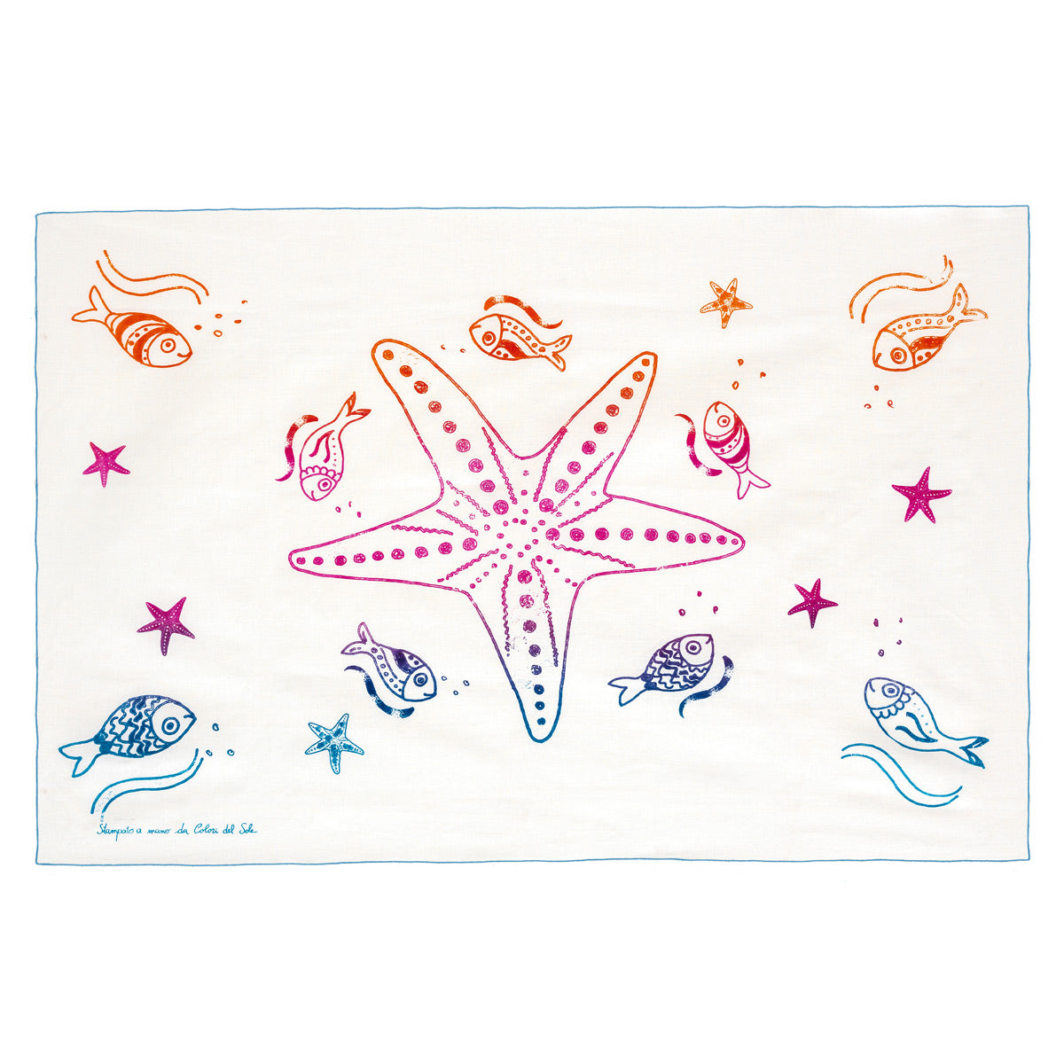 Il disegno raffigura stelle marine e pesci stilizzati nelle tonalità vivaci del turcherse fucsia e arancione, simboli della tradizione mediterranea.