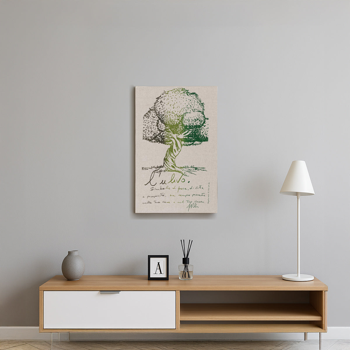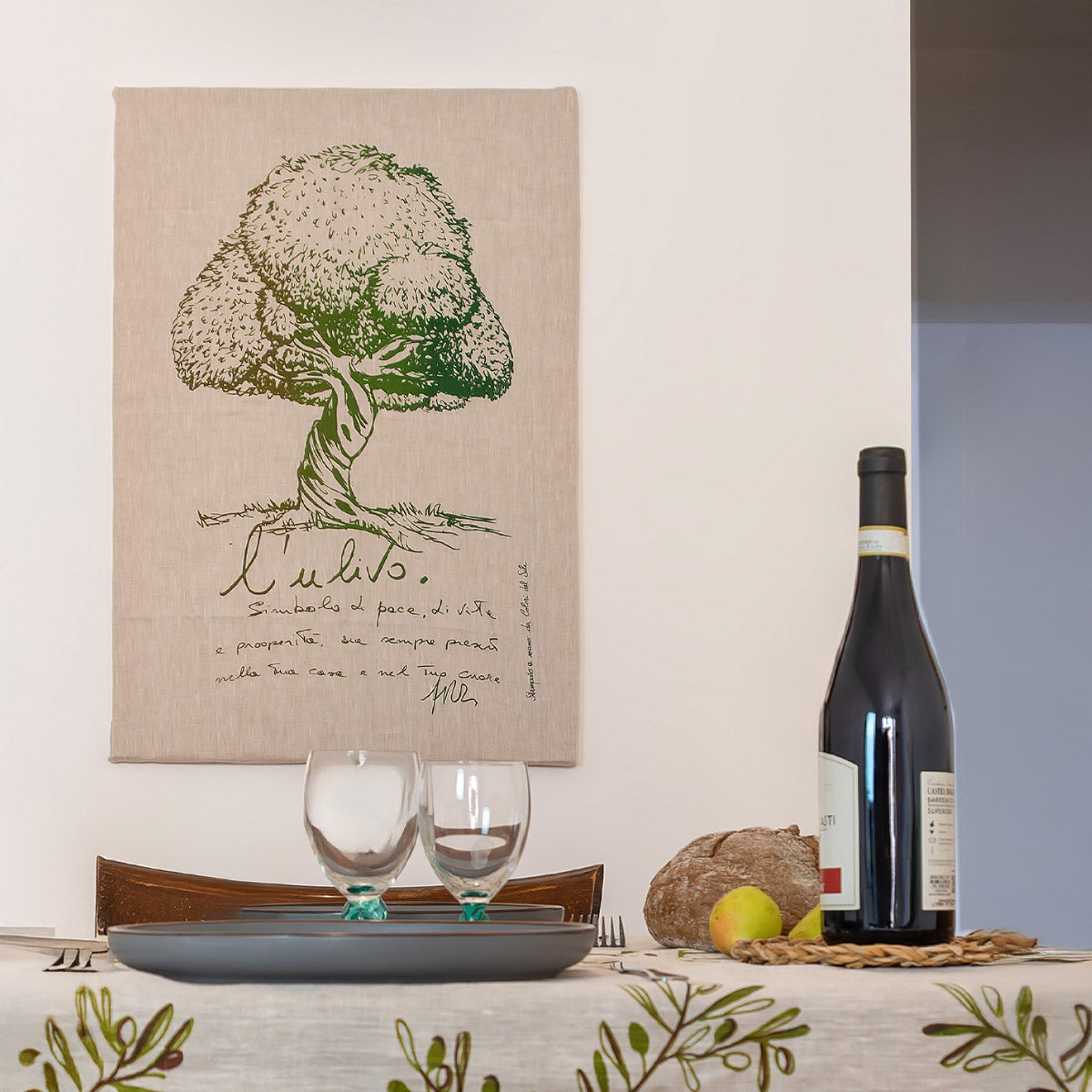 Arazzo da parete artigianale stampato a mano su lino naturale. Texture delicata e toni del verde in un telo che trova equilibrio in ogni ambiente della casa, donando all’arredamento un carattere rustico ed originale. L'arazzo Ulivo si appende alla parete con il telaio di legno piccolo.