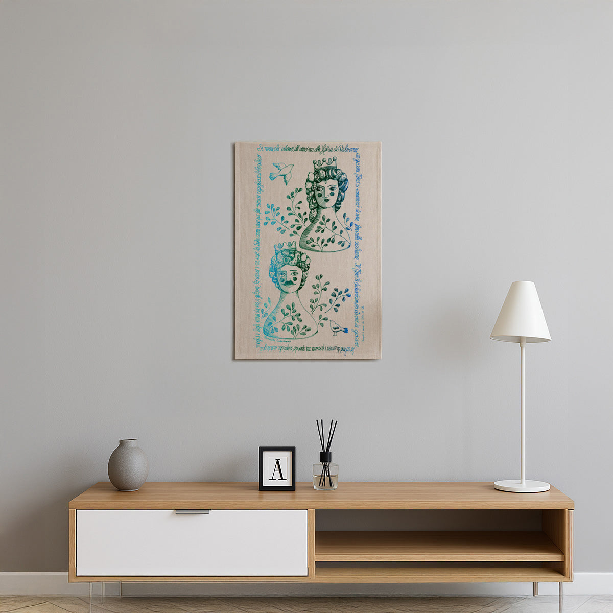 Arazzo da parete in misto lino stampato a mano con colori ad acqua. La stampa riporta due soggetti del folclore mediterraneo: il Moro e la Dama, protagonisti di tormentate vicende d'amore e gelosia. L'arazzo Ziti si appende alla parete con il telaio di legno piccolo.