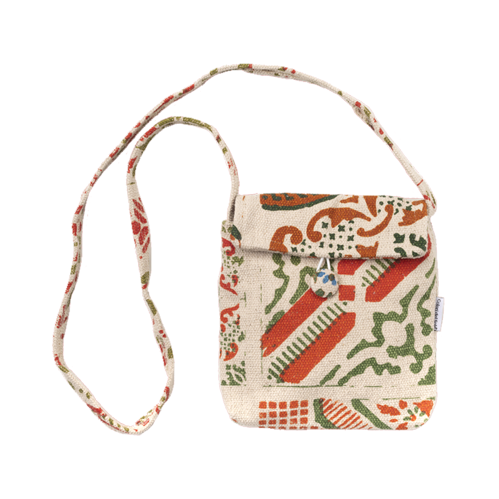 Borsa a tracolla in cotone stampata a mano. Chiusura con bottone bombato in tessuto e gancio elastico. Disponibile in sette originali varianti adattabili alle occasioni di tutti i giorni.
