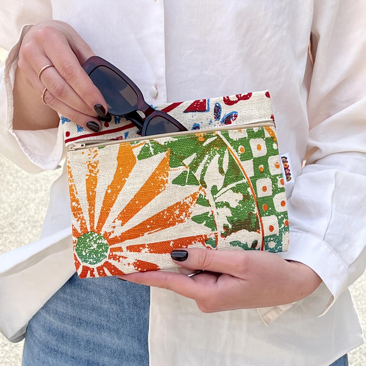 La bustina portaoggetti Stefania è un accessorio da borsa stampato a mano. Comoda e versatile, è utilizzabile come piccolo portadocumenti, porta trucchi, porta accessori. Disponibile in diverse fantasie, abbinabili alle borse presenti nel nostro sito.