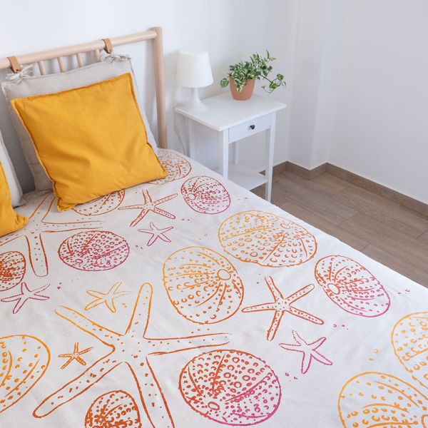 Copriletto matrimoniale artigianale con stampa realizzata a mano nei torni dell'arancione. Complemento d'arredo ideale per una camera da letto originale e vivace.