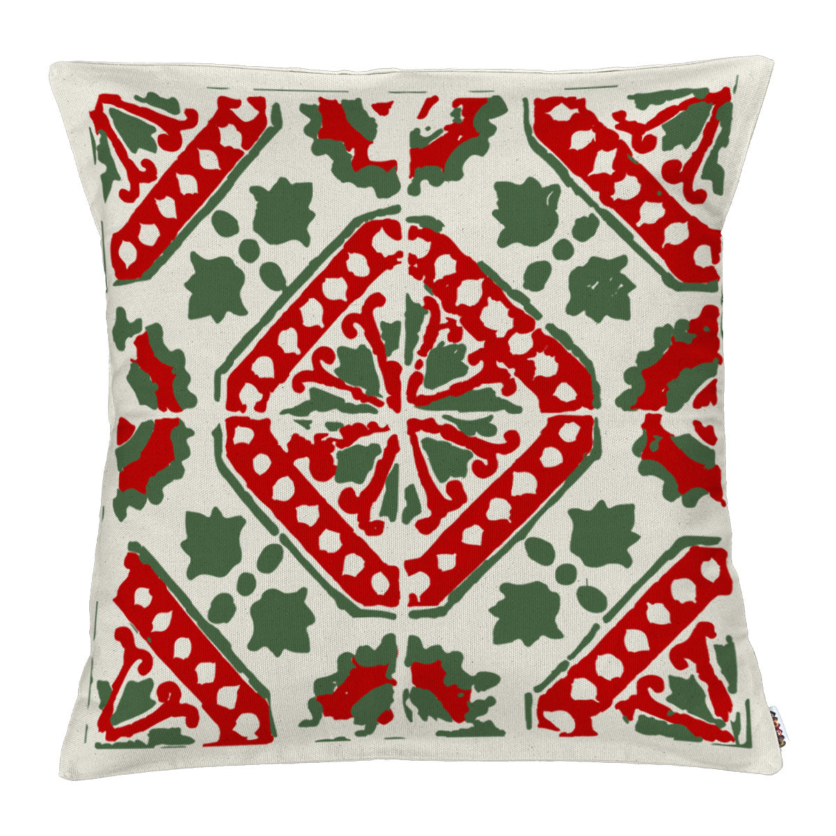 Federa per cuscino in puro cotone, con stampa serigrafica manuale piazzata sul fronte nei tradizionali toni del verde e del rosso, che evocano la calda e accogliente atmosfera del Natale.