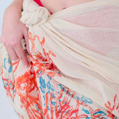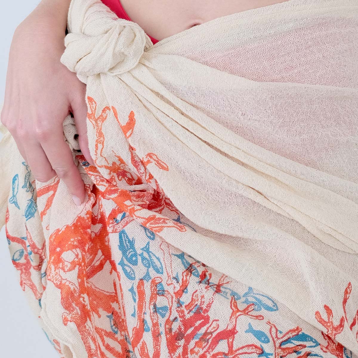 Pareo di cotone stampato a mano con tecnica serigrafica.