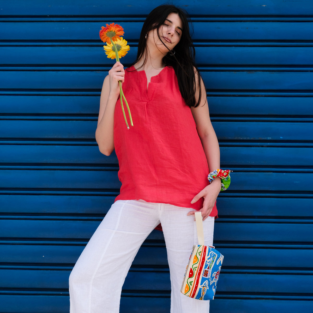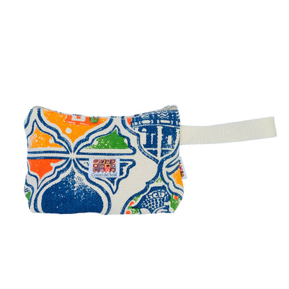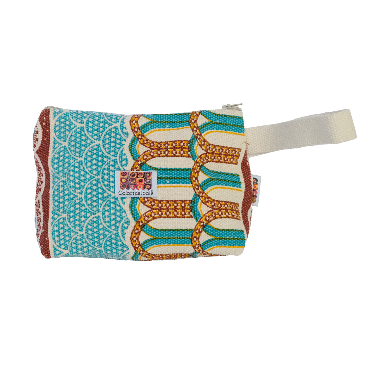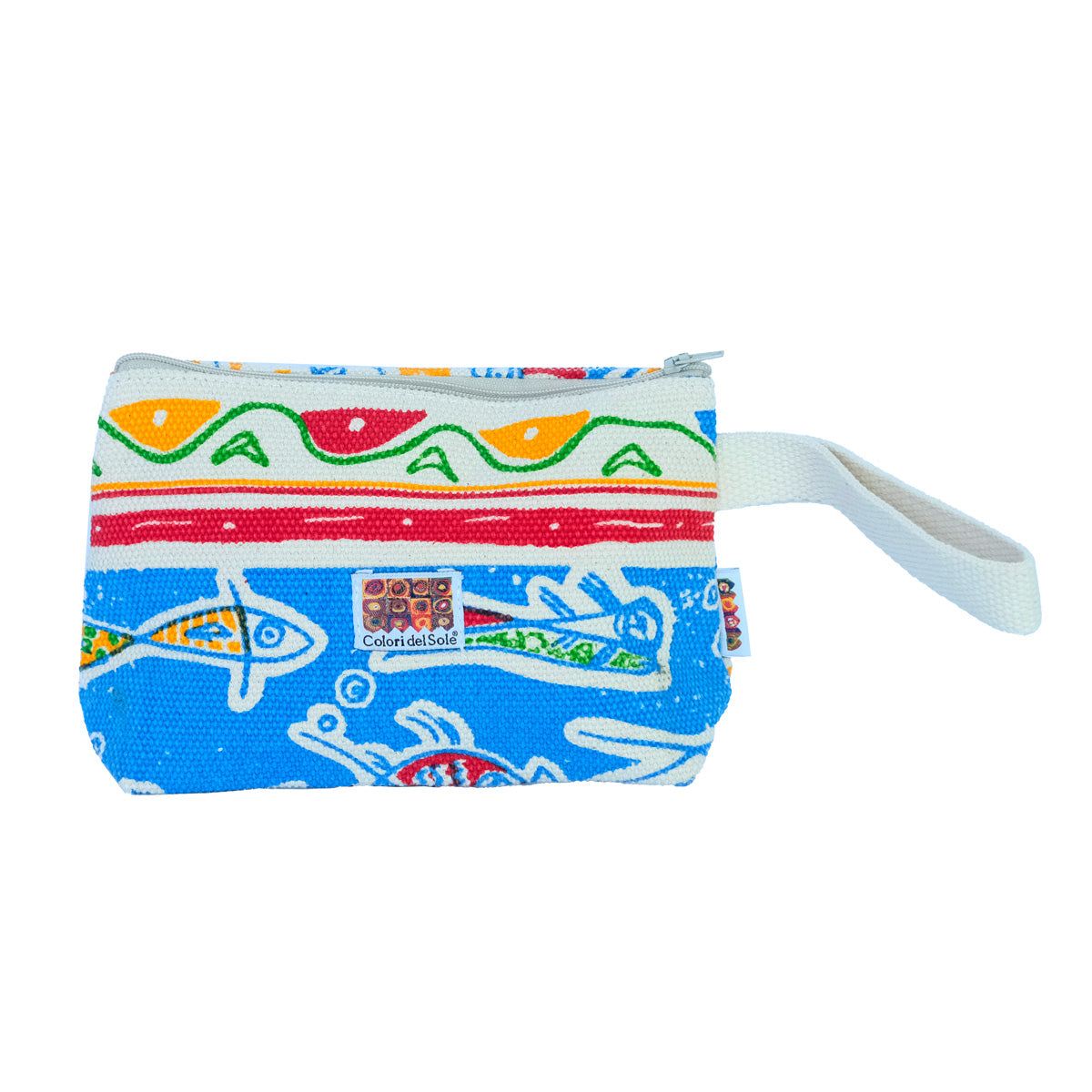 Pochette dal design versatile, realizzata in cotone e stampata a mano con colori ad acqua. Pratica e maneggevole, è rifinita con una cerniera e un comodo manico laterale in tessuto. Disponibile in sette diverse fantasie.