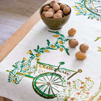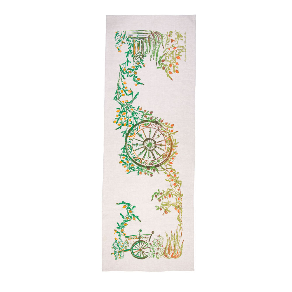 Runner da tavola in lino naturale decorato da stampa serigrafica realizzata a mano. I tessili da cucina di lino trovano un equilibrio perfetto tra semplicità, qualità e modernità e portano sulla tavola la bellezza dei prodotti made in Italy.