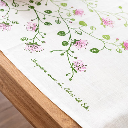 Il runner Cappero è il must per una mise en place elegante e delicata, adatta alle occasioni più importanti. Il tessuto naturale è impreziosito dalla stampa fresca con motivi botanici nei toni del verde e del lilla.