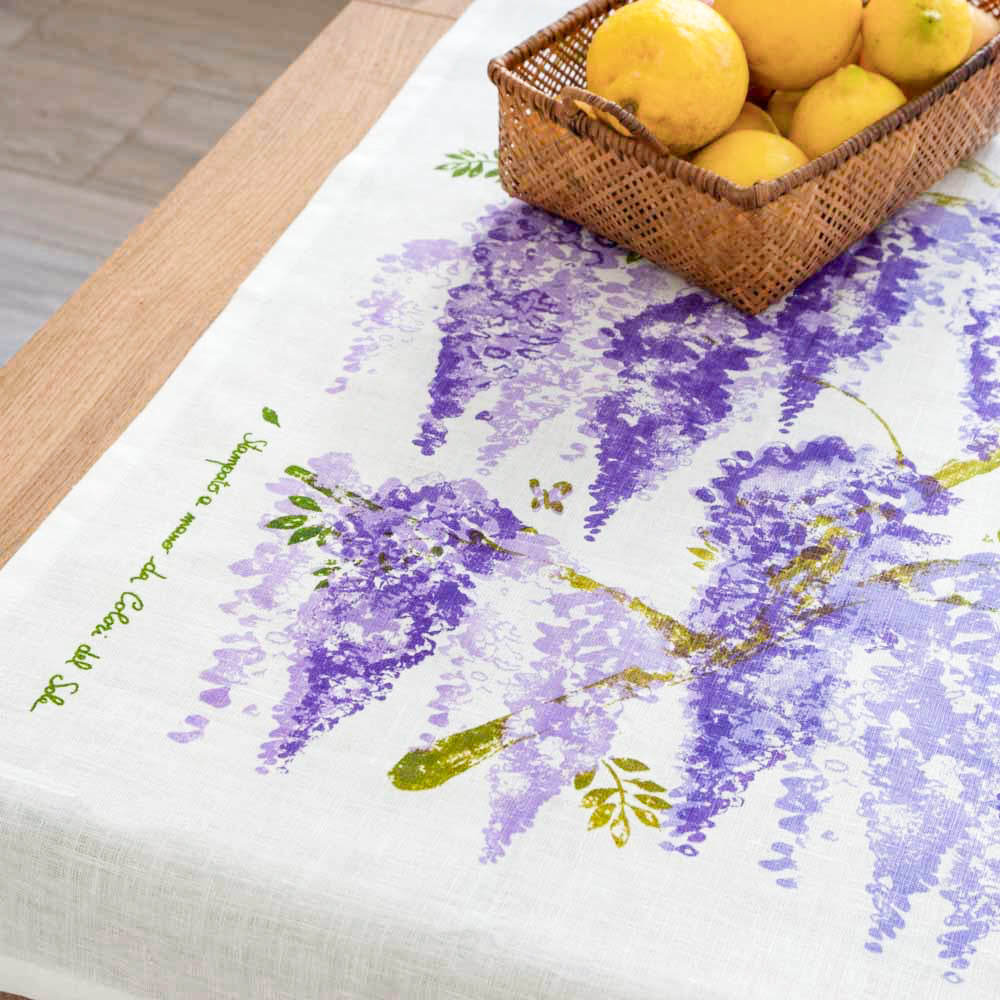 Runner da tavola 100% lino decorato da stampa serigrafica realizzata a mano. Fantasia floreale con rappresentazione del Glicine.