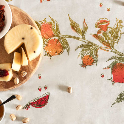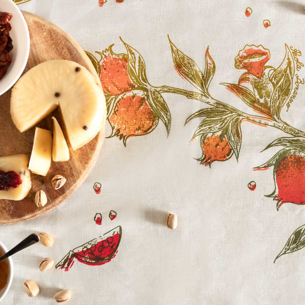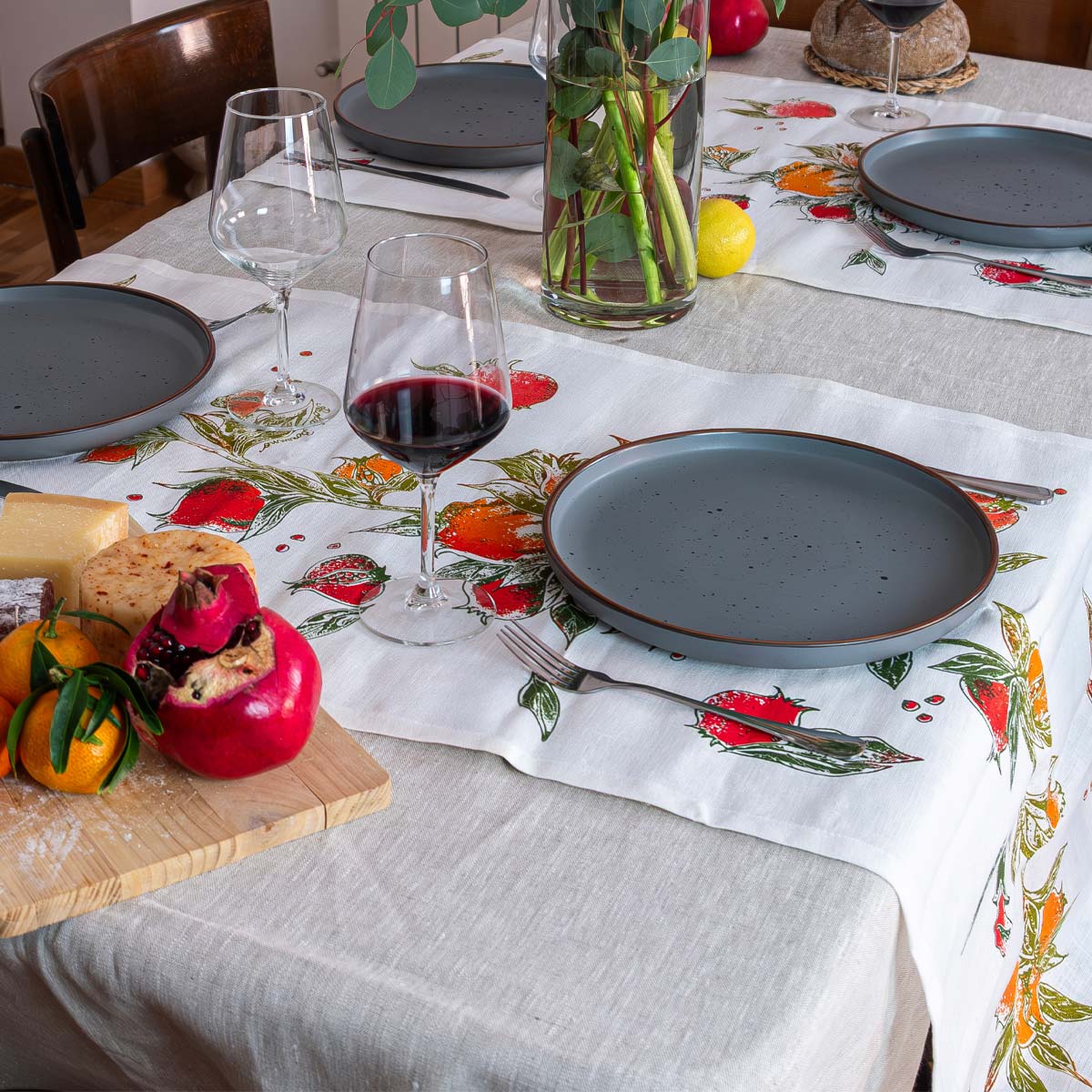Runner di lino decorato da stampa serigrafica con colori ad acqua. Il tessuto naturale e la ricchezza della stampa artigianale rendono il runner Melograno il protagonista di una mise en place semplice ed elegante. L’ideale per chi ama i colori vivaci che richiamano gli elementi naturali. Pensata ispirandoci alle bellezze autunnali, ma perfetta per ogni periodo dell’anno.