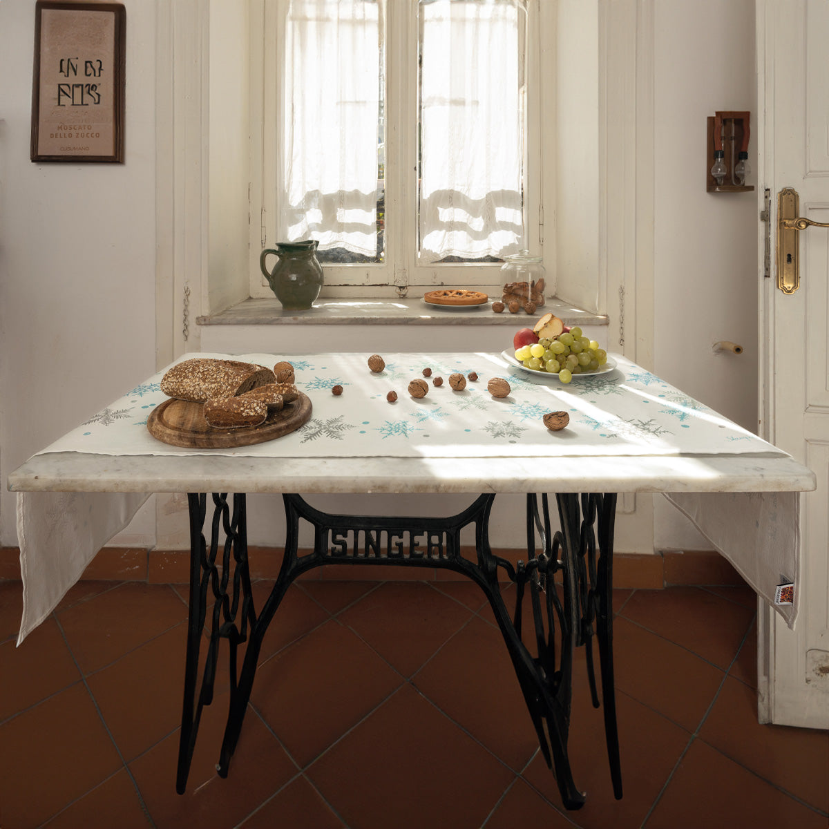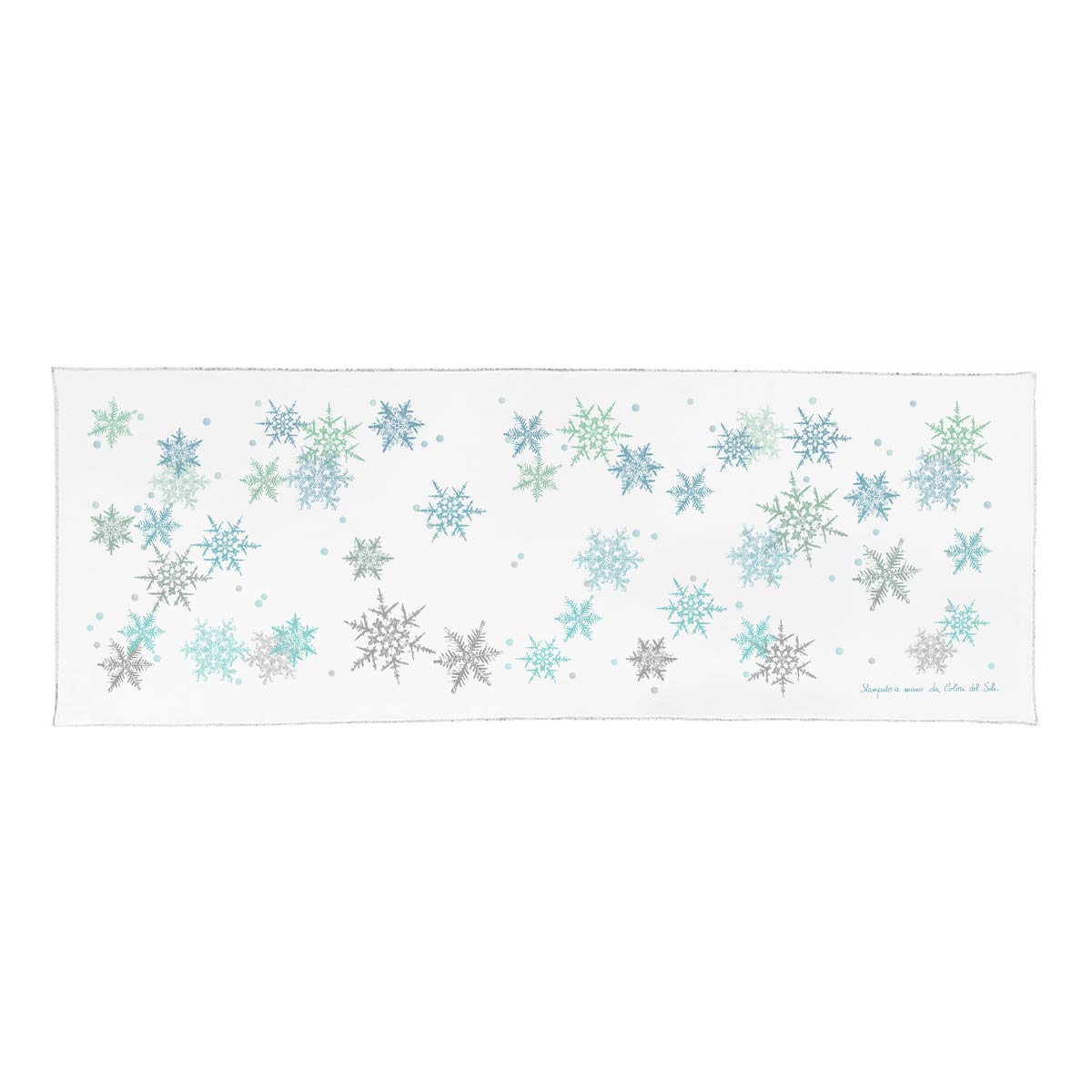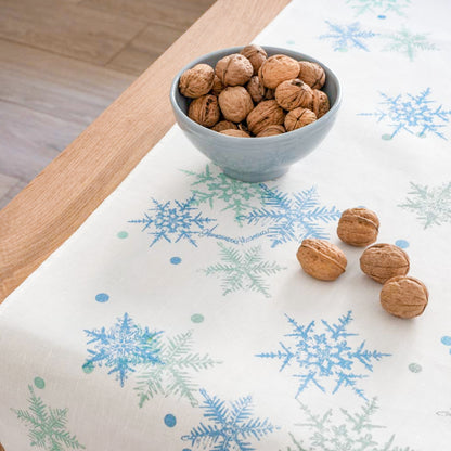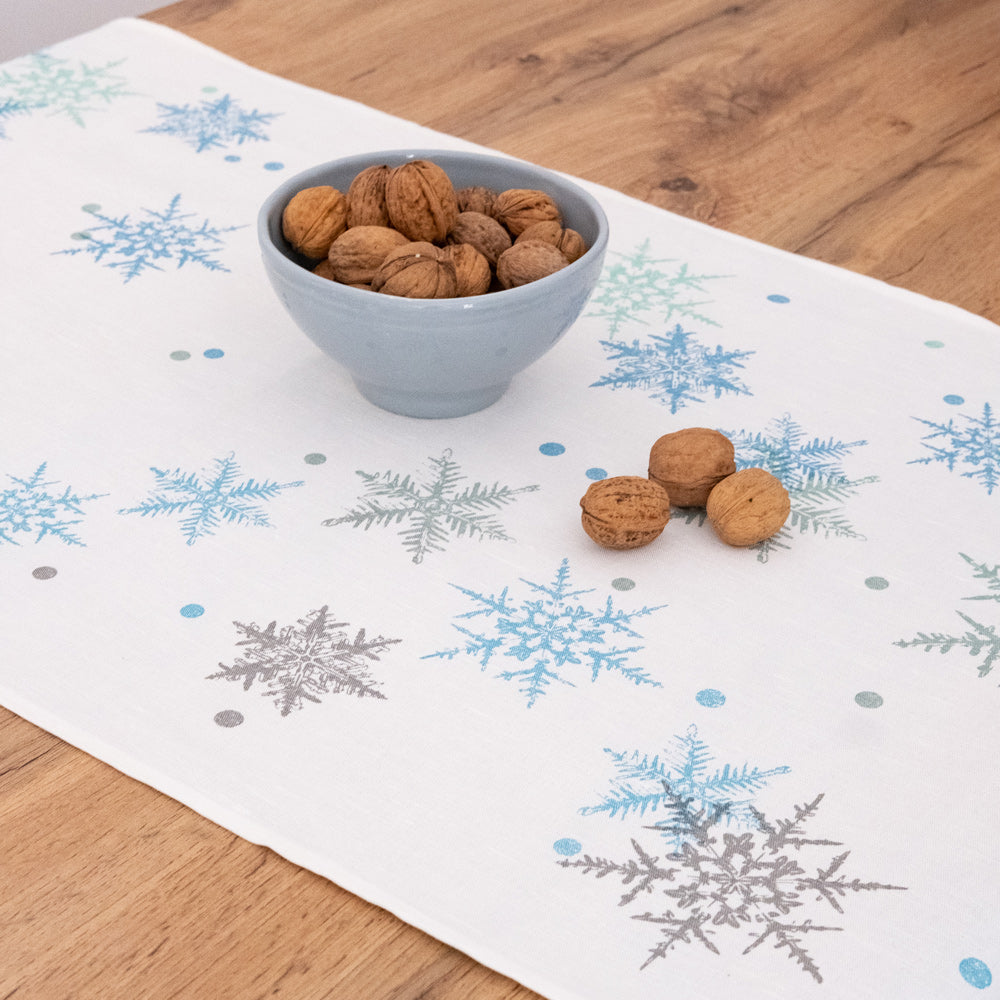 Runner da tavola in puro lino, impreziosito da una stampa serigrafica artigianale che raffigura delicati fiocchi di neve nei raffinati toni del blu su trama bianca.
