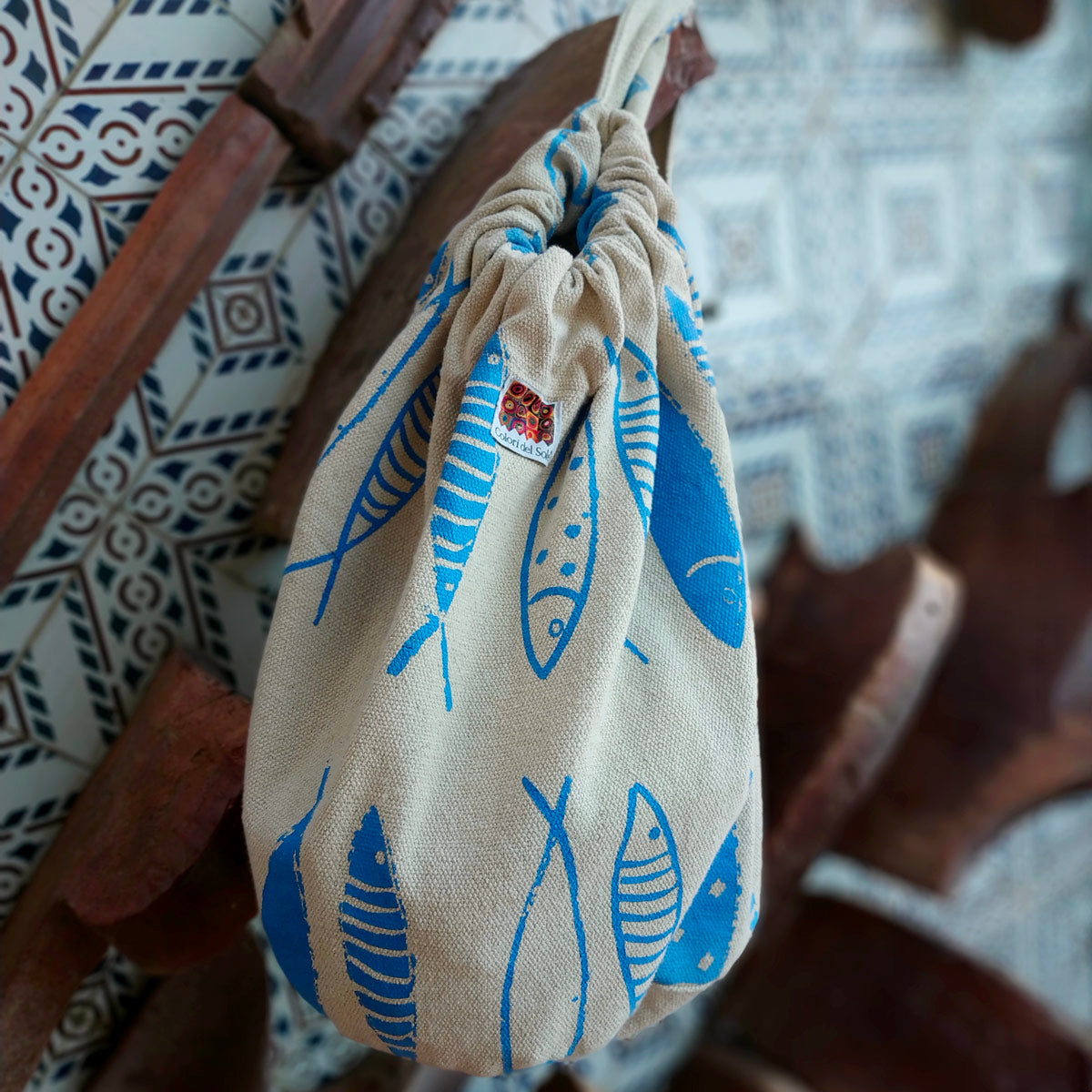 Borsa pratica e versatile a forma di sacca, realizzata in robusto cotone e stampata a mano. Rifinita con due pratiche bretelle e chiusura a cappio con cordino. Disponibile in diverse fantasie.