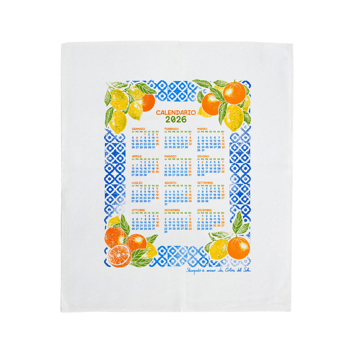 Strofinaccio con stampa calendario 2026. Realizzato in cotone e decorato con stampa serigrafica artigianale.