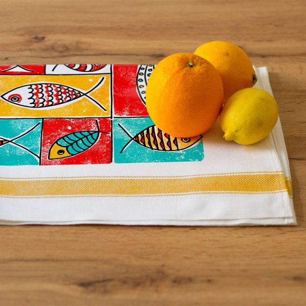 Porta l'arte in cucina e rendi la preparazione di ogni pasto un'esperienza vivace e colorata. Lo strofinaccio Pesci Mondrian è realizzato in puro cotone ed è decorato da una stampa serigrafica con pesci e geometrie colorate. La linea Pesci Mondrian con un design geometrico, colorato e audace, omaggia il noto artista omonimo e porta sulla tavola la vivacità e il gusto tipici dell'arte moderna.