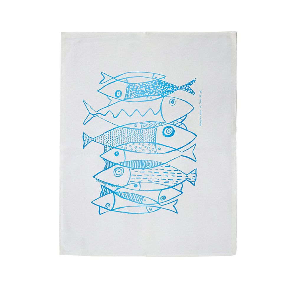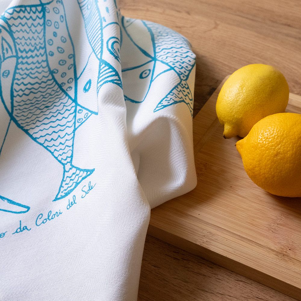 Strofinaccio artigianale versatile e colorato. Cotone bianco e stampa serigrafica a tema marino nei toni del blu.