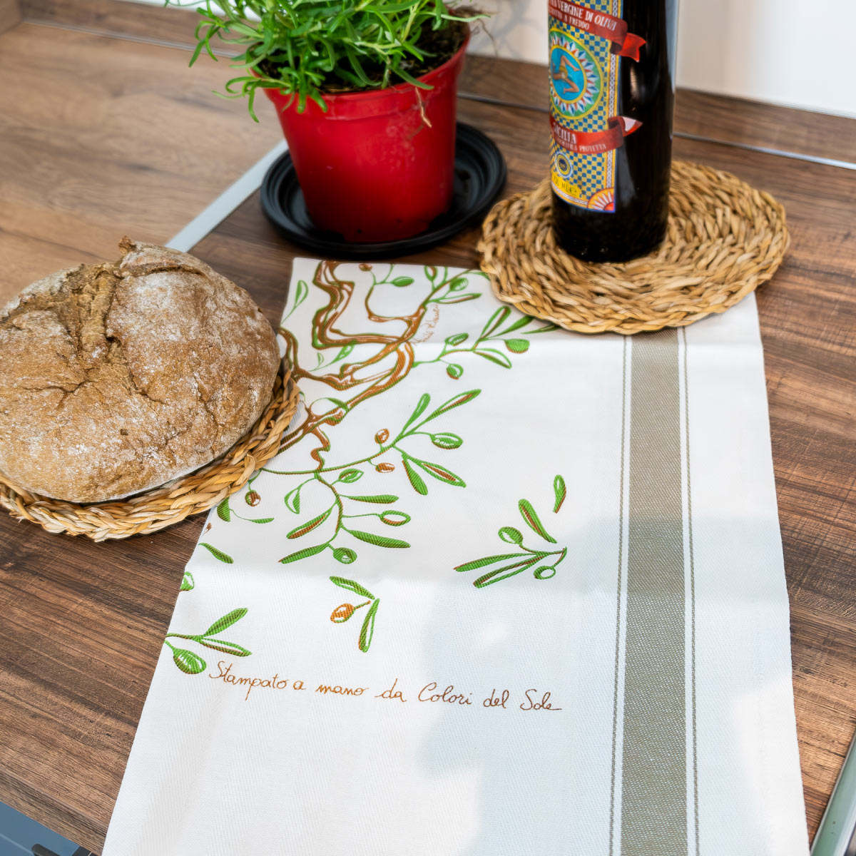 Strofinaccio in puro cotone decorato da stampa con rami di ulivo realizzaai con la tecnica serigrafica. Elemento decorativo d'impatto per portare in cucina eleganza oltre che funzionalità. La stampa artigianale, contrariamente alla stampa digitale, penetra le fibre del tessuto e ne esalta la trama, conferendo ai prodotti dettagli ben definiti e vividi.