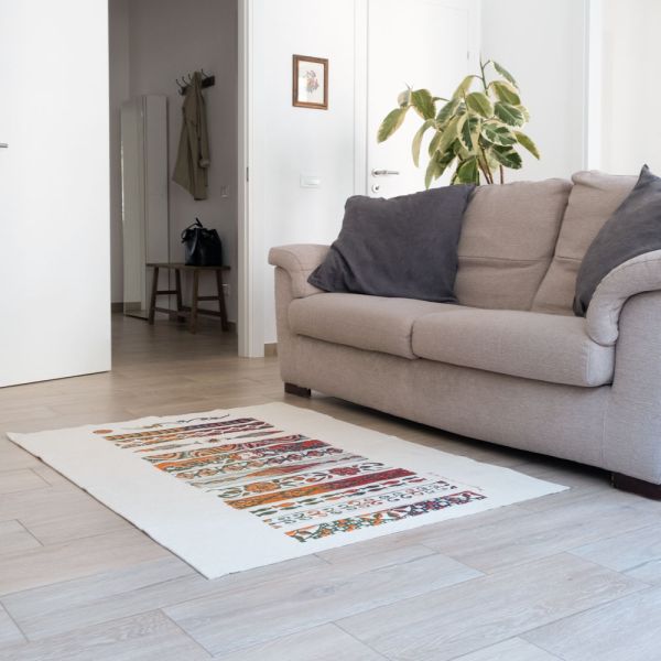Moderno, colorato, vivace: il tappeto Gottuso rende accogliente qualsiasi stanza. Stampato artigianalmente con la tecnica serigrafica su un tessuto misto cotone – canapa, è un prodotto versatile e adatto ad ogni ambiente della casa.