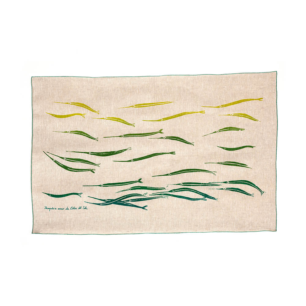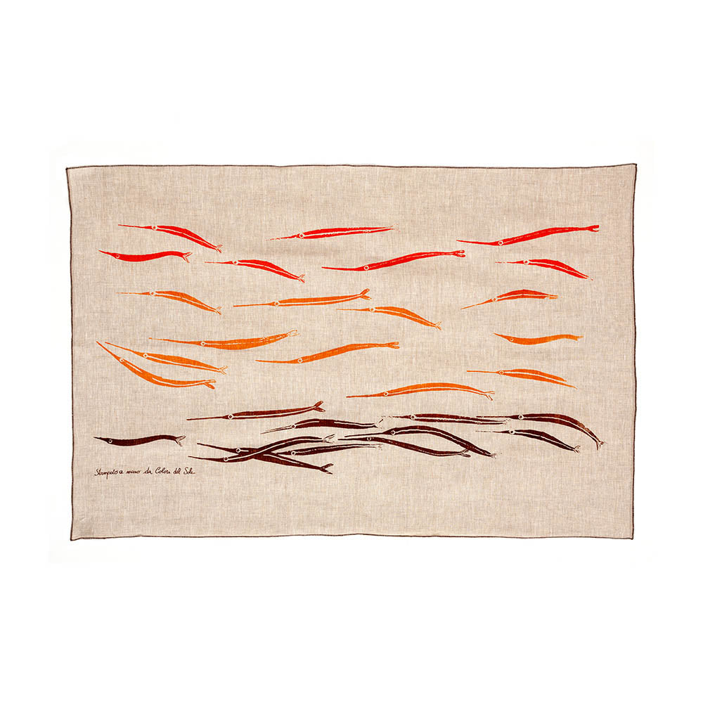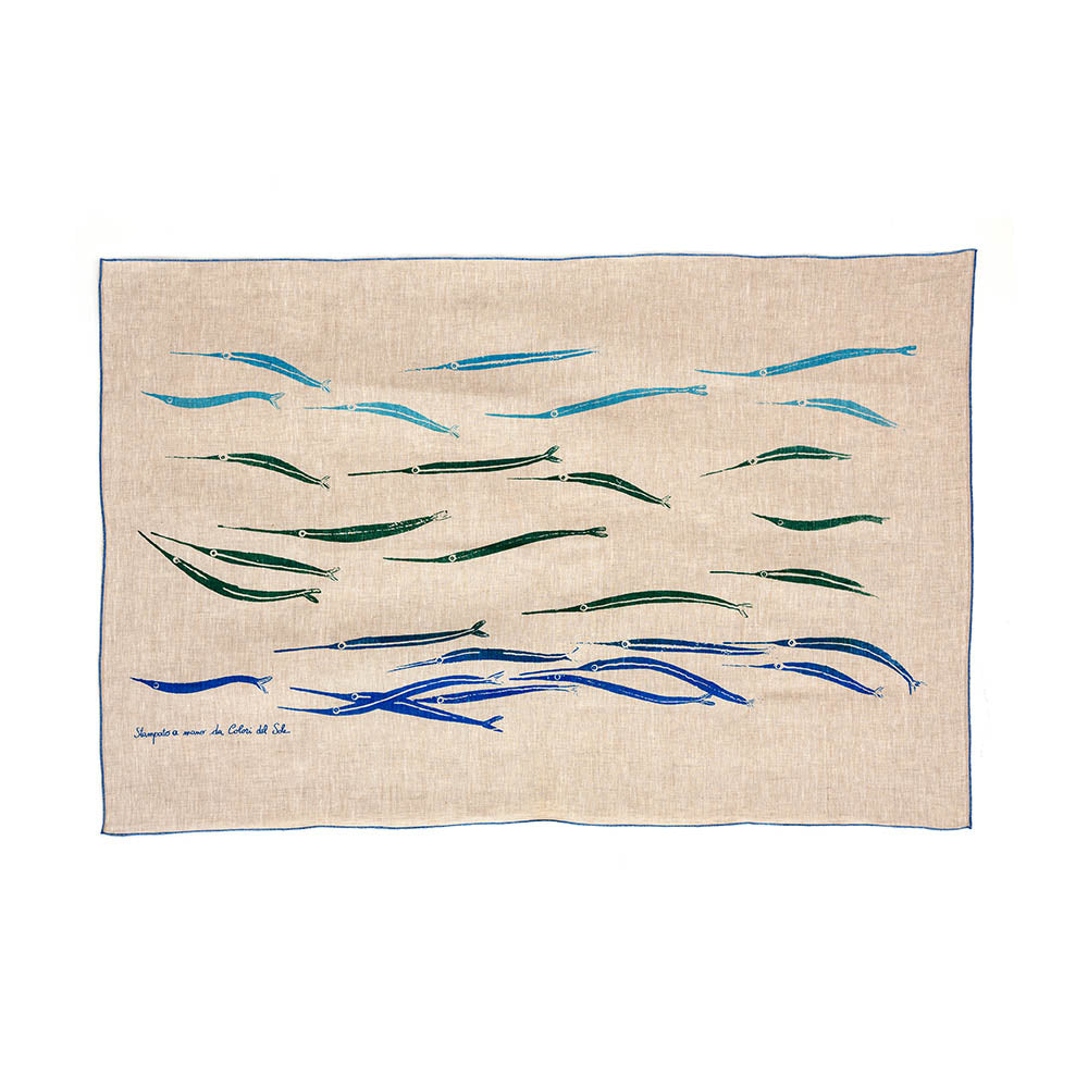 Telo mare di lino stampato a mano con tecnica serigrafica. Trama sottile, texture delicata e disegno dalle linee dinamiche e colorate. Disponibile in tre colori diversi.