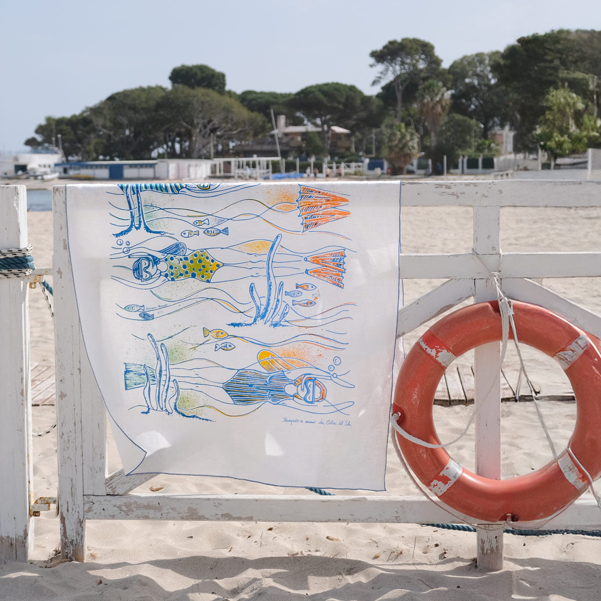 Telo mare stampato a mano su tessuto 100% lino. Le figure femminili di Nuotatrici, eleganti e flessuose, si muovono in armonia creando una composizione dinamica e solare. Un omaggio alla libertà, alla bellezza del gesto e all’estate mediterranea.