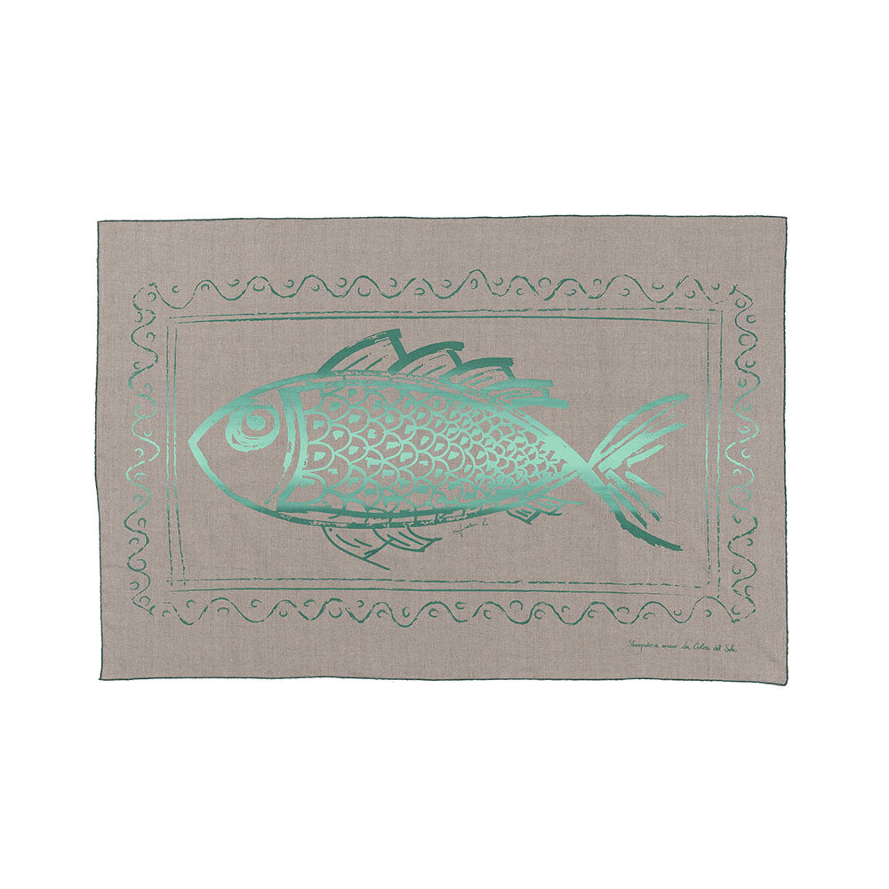 Telo mare di lino naturale decorato da stampa serigrafica realizzata a mano.