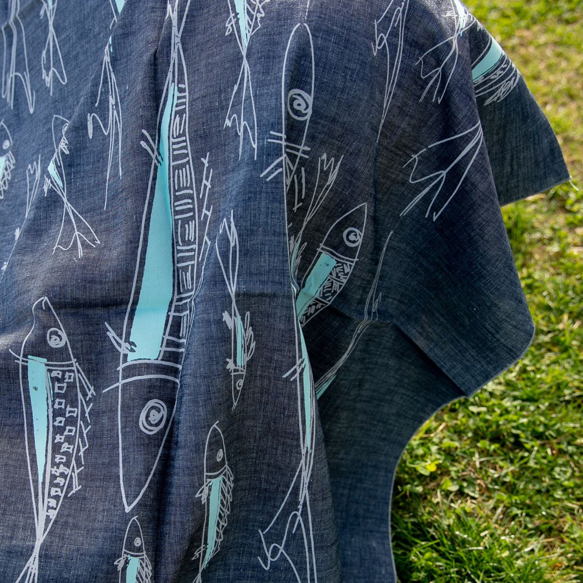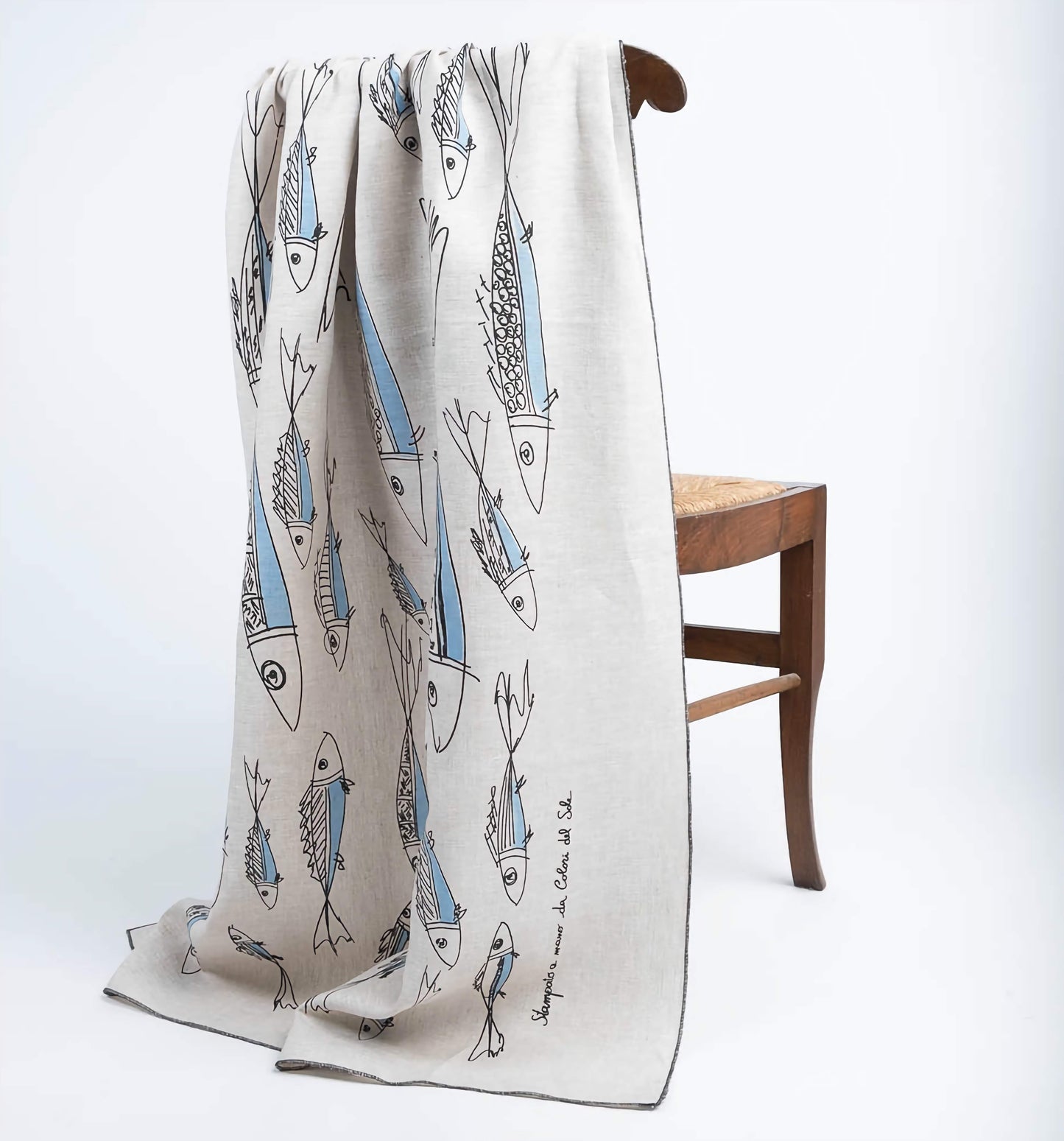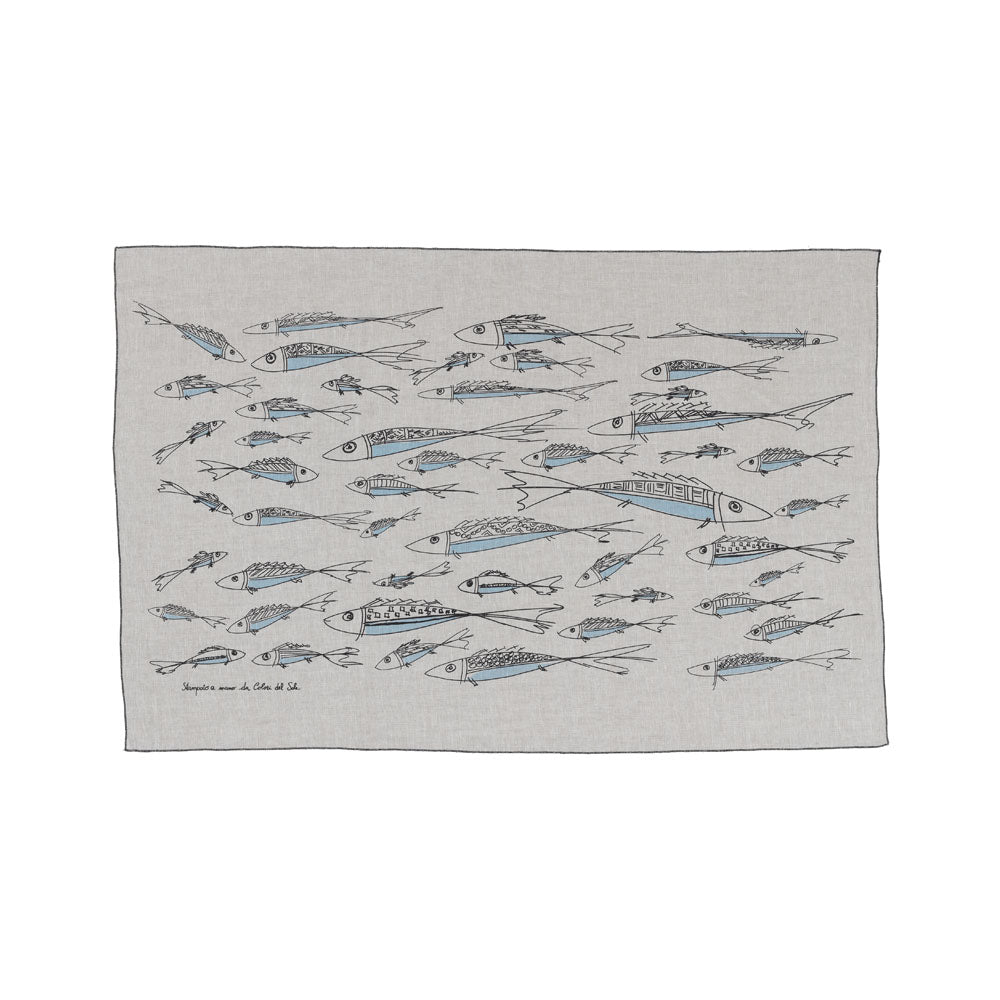 Il telo mare Sardine è un prodotto artigianale realizzato a mano con stampa serigrafica su tessuto di lino. Disponibile in due varianti.