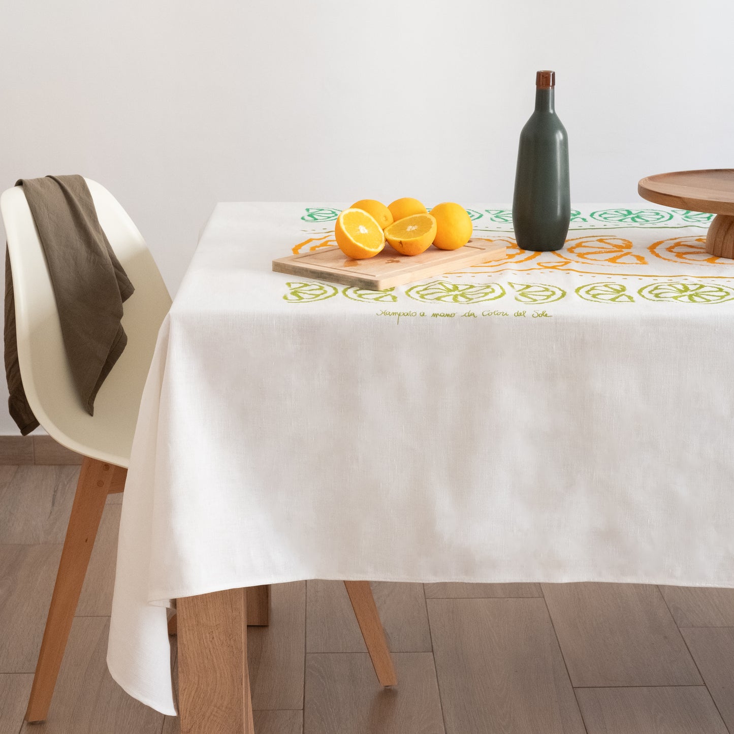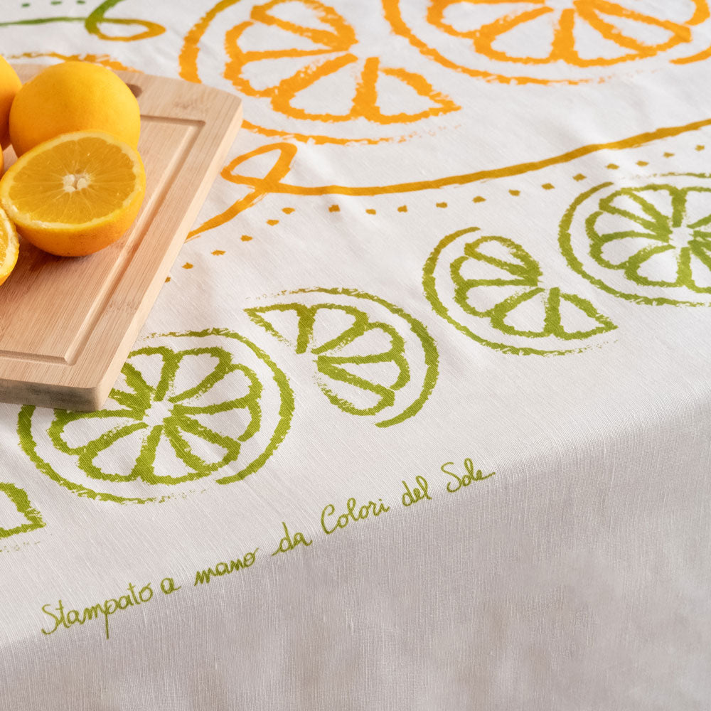 La Tovaglia Rettangolare Arance, in tessuto di alta qualità, unisce freschezza ed eleganza con motivi di fette d'arancia in tonalità arancioni e verdi, stampate a mano. Perfetta per donare vivacità alla tavola, si adatta a ogni arredamento e occasione informale, garantendo un look fresco e solare.