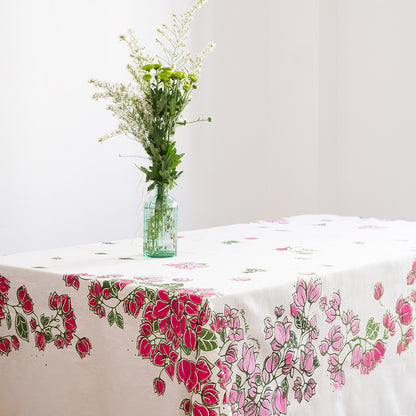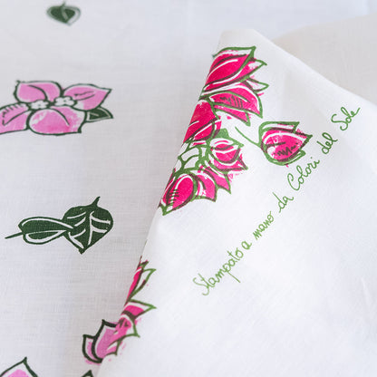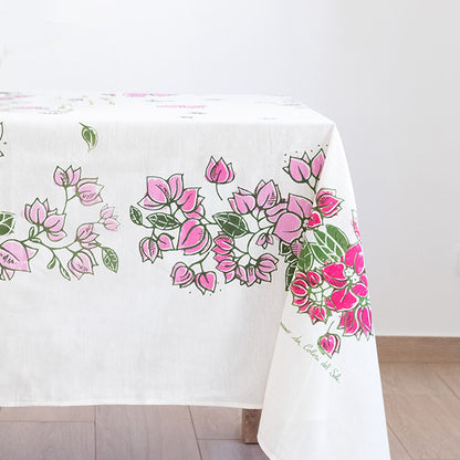 Tovaglia rettangolare di lino decorata da motivi floreali. La tovaglia Bouganville porta freschezza ed eleganza sulla tavola, con una mise en place che stupisce per la sua ricchezza. Tessuto 100% lino e stampa realizzata a mano con colori ad acqua mediante l’uso dell’antica tecnica serigrafica.