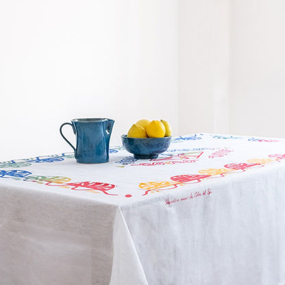 Minimalista, geometrica e colorata, la tovaglia Carretto è l’accessorio perfetto per donare alla cucina un accento colorato e vivace. Stampa serigrafica realizzata a mano con colori ad acqua su tessuto in lino naturale dal tono neutro.